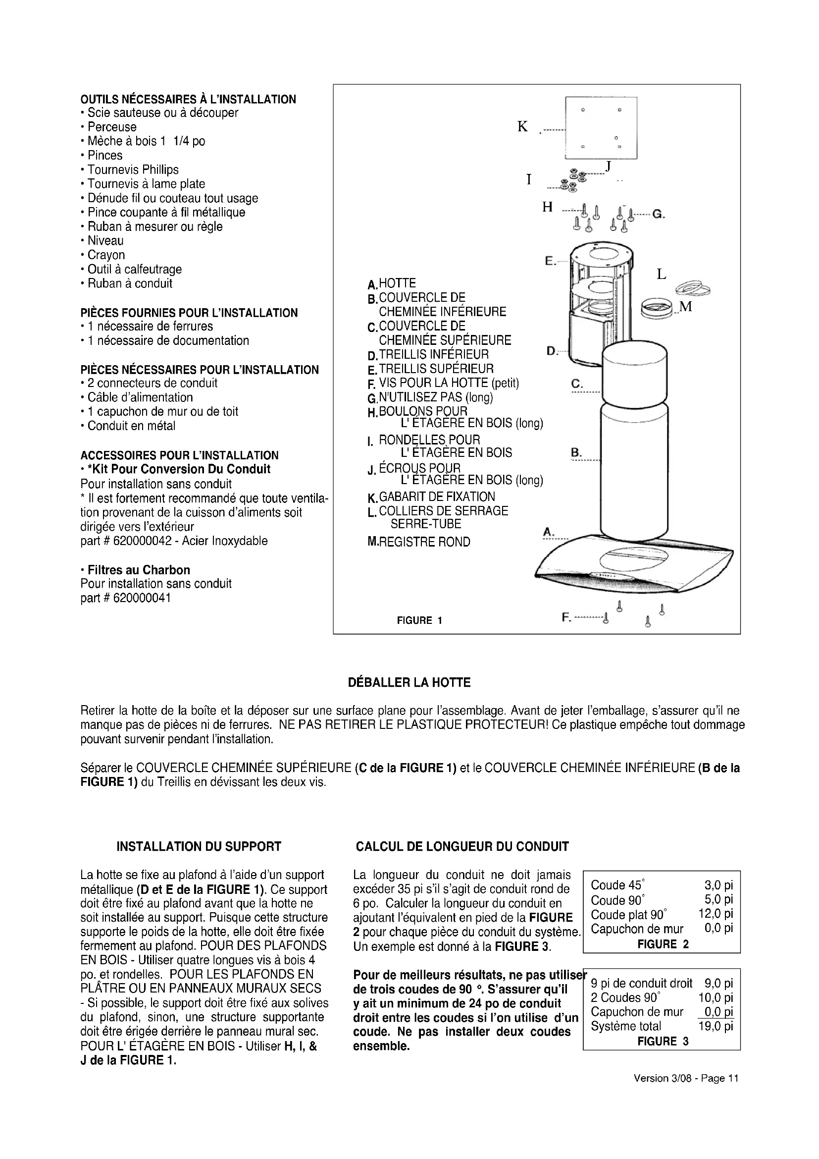 La hotte se xe au plafond à l’aide d’un support métallique (D et E de la FIGURE 1). Ce support doit être xé au plafond avant que la hotte ne soit installée au support. Puisque cette structure supporte le poids de la hotte, elle doit être xée fermement au plafond. POUR DES PLAFONDS EN BOIS - Utiliser quatre longues vis à bois 4 po. et rondelles. POUR LES PLAFONDS EN PLÂTRE OU EN PANNEAUX MURAUX SECS - Si possible, le support doit être xé aux solives du plafond, sinon, une structure supportante doit être érigée derrière le panneau mural sec. POUR L' ÉTAGÈRE EN BOIS - Utiliser H, I, & J de la FIGURE 1. REGISTRE ROND
