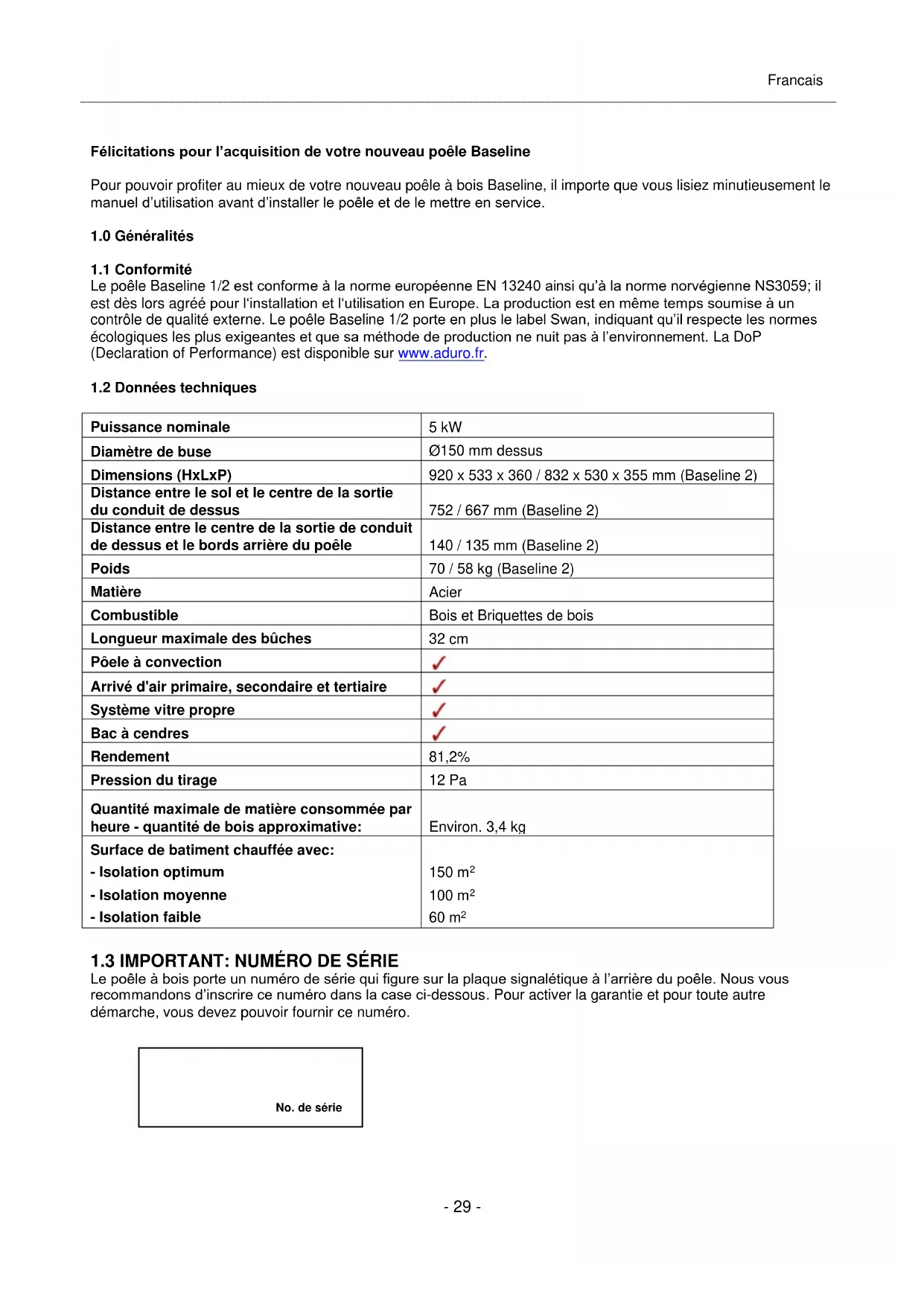 Félicitations pour l’acquisition de votre nouveau poêle Baseline Pour pouvoir profiter au mieux de votre nouveau poêle à bois Baseline, il importe que vous lisiez minutieusement le manuel d’utilisation avant d’installer le poêle et de le mettre en service.