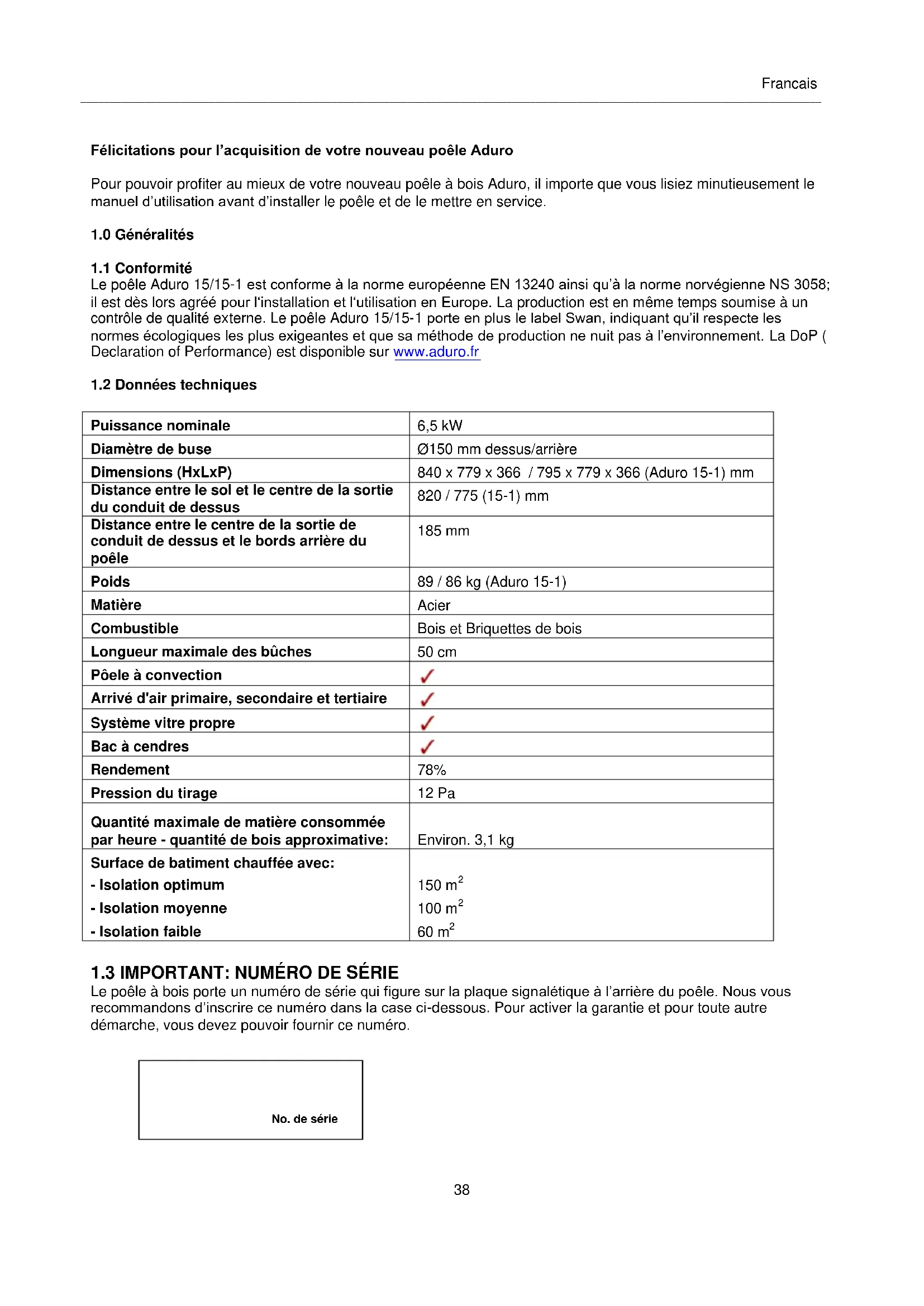 Le poêle à bois porte un numéro de série qui figure sur la plaque signalétique à l’arrière du poêle. Nous vous recommandons d’inscrire ce numéro dans la case ci-dessous. Pour activer la garantie et pour toute autre démarche, vous devez pouvoir fournir ce numéro.