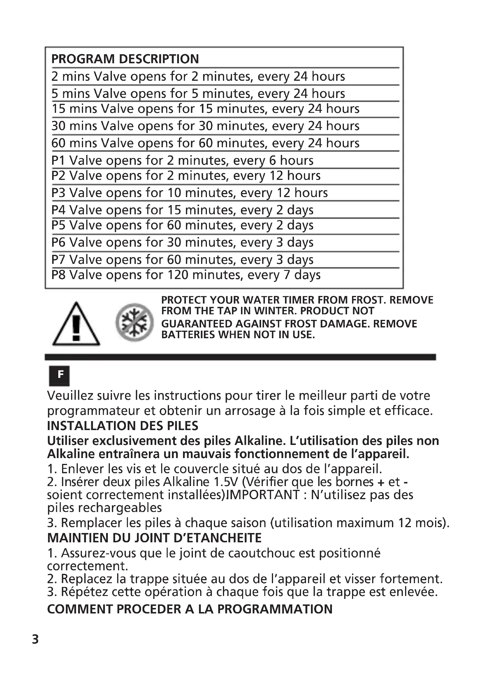 a) La durée de l’opération voulue une fois par jour. Ou bien b) Le programme choisit pour toutes les autres fréquences d’arrosage (voir tableau). Le programmeur mettra en marche le programme sélectionné de manière répétée jusqu’à ce qu’une nouvelle option soit sélectionnée. ARRET automatique. Tournez la minuterie pour sélectionner la MISE EN MARCHE ou l’ARRET manuel. Si vous désirez revenir à l’arrosage automatique re-sélectionnez le programme d’arrosage désiré. NOTE : l’heure de démarrage automatique reste en mémoire jusqu’à ce qu’une nouvelle heure soit sélectionnée. Changement du programme d’arrosage Mettre le cadran sur un nouveau programme . Ne pas tourner le cadran sur AUTO START sauf si on désire enregistrer un nouvel horaire de démarrage. FONCTIONNEMENT MANUEL Démarrage manuel Tourner le cadran dans le sens inverse des aiguilles d’une montre, sur ON. L’arrosage durera 60 mn maximum ou jusqu’à l’arrêt demandé en appuyant sur OFF. Note: après 60 minutes, l’arrosage s’arrête. Le bouton sera toujours sur ON et il sera nécessaire de le remettre manuellement sur OFF ou de sélectionner un nouveau temps d’arrosage en minutes. Arrêt manuel Tourner le cadran dans le sens des aiguilles d’une montre, sur OFF. Note: le fonctionnement ne s’entend que lorsque la vanne s’ouvre et se ferme. Pour vérifier que le programmateur fonctionne, mettre sur “MANUAL ON ou OFF” pour entendre la vanne s’ouvrir ou se fermer.
