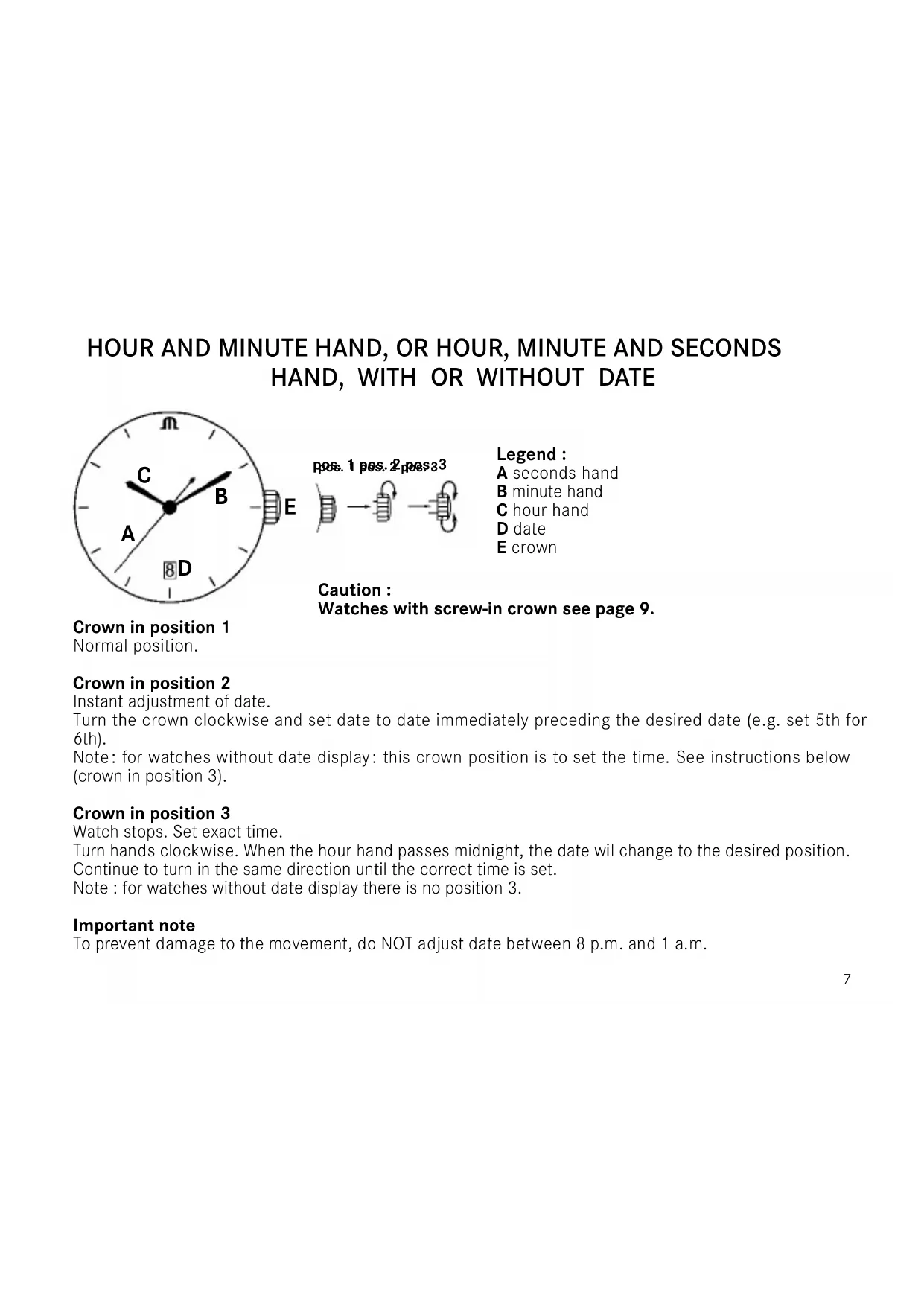 Légendes: A aiguille des secondes B aiguille des minutes C aiguille des heures D quantièmeE couronne Attention: Montres avec couronne vissée, voir page 11 Mode d’emploi pour montres à quartz avec: Aiguille des heures et des minutes, ou aiguille des heures, des minutes et des secondes, avec ou sans indicateur de quantième Couronne en position 1: Position normale. Couronne en position 2: Correction rapide du quantième. Tourner en sens horaire jusqu’à ce que le quantième indiqué soit celui de la veille du jour souhaité. Remarque: si vous avez une montre sans quantième, cette position de la couronne permet la mise à l’heure précise; voir les instructions données sous couronne en position 3. Couronne en position 3: Inaction de la montre. Mise à l’heure précise. Tourner les aiguilles en sens horaire. Au passage de l’aiguille des heures à minuit, le quantième passera à la position souhaitée. Continuer à tourner dans le même sens jusqu’à ce que les aiguilles indiquent l’heure précise. Remarque: les montres sans quantième n’ont pas cette position de couronne. Remarque importante: Entre 20.00 heures et 01.00 heure, la correction rapide du quantième est impossible, le mécanisme de quantième étant en fonction. pos. 1 pos. 2 pos. 3
