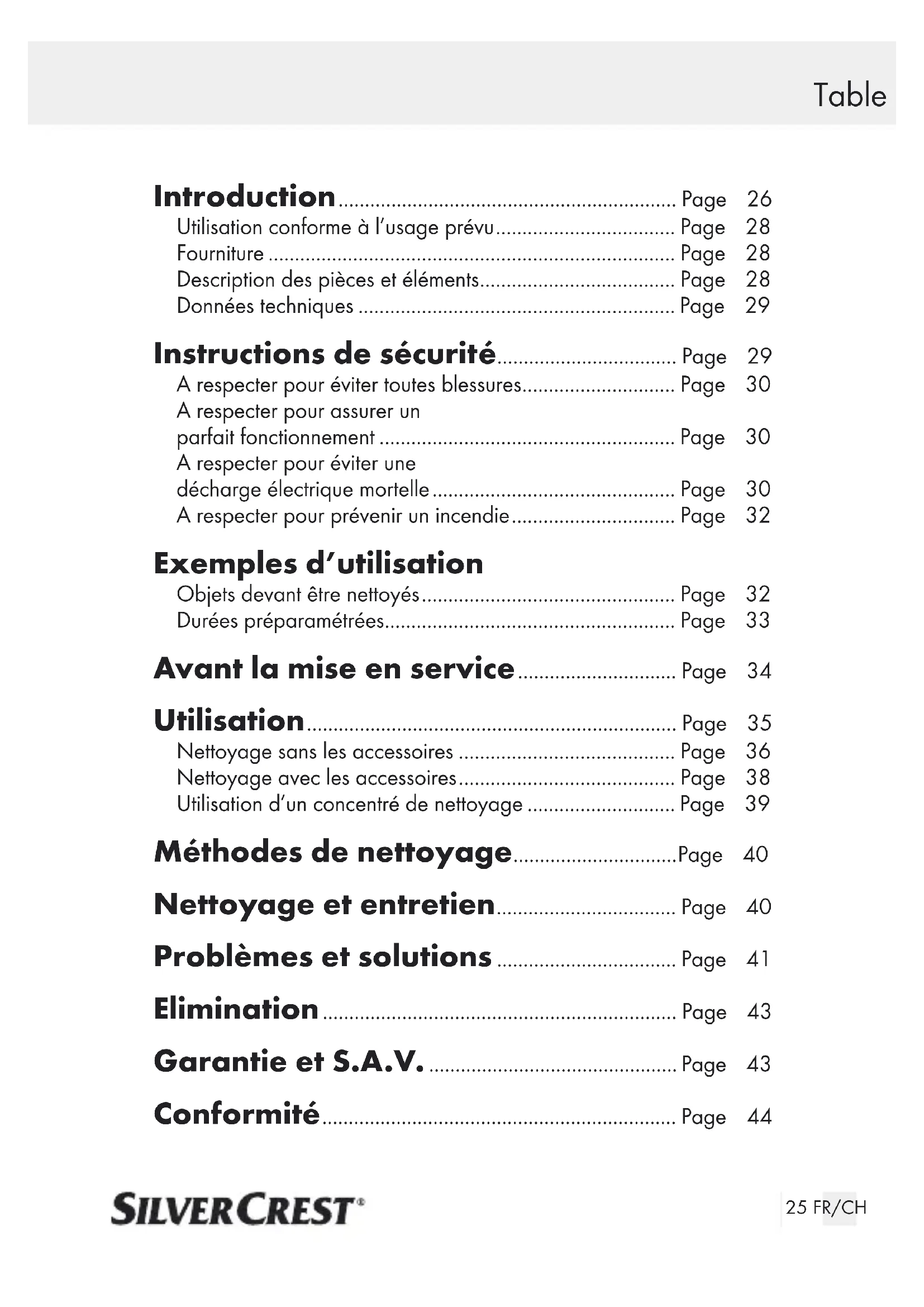 Garantie et S.A.V. Pour l‘assistance téléphonique compétente pour votre pays, consultez les documents de garantie ci-joint. Notre appareil a été fabriqué avec le plus grand soin. Si, cependant, une panne venait à survenir, nous assumons bien enten- du, dans le cadre de nos conditions de garantie, la garantie d‘un état et d‘un fonctionnement parfaits du produit. La durée de garantie est de 36 mois et entre en vigueur à la date d‘achat du produit. Conservez le bon de caisse à titre de preuve de votre achat. L‘obligation légale de garantie n‘est pas limitée par la présente garantie. Sont exclus de la garantie: - les dommages au niveau de pièces cassables ou fragiles. - les dommages relevant d‘interventions interdites.44 FR/CH Sicherheit / Bedienung Garantie et S.A.V. / Conformité - les dommages relevant de l‘utilisation de pièces de rechange autres que les pièces d‘origine. - les dommages relevant d‘une manipulation incorrecte. - les dommages relevant d‘un cas de force majeure. - les dommages relevant du non respect des instructions d‘entretien. De même, nous ne pouvons assumer aucune responsabilité pour les conséquences d‘une utilisation incorrecte de l‘appareil.