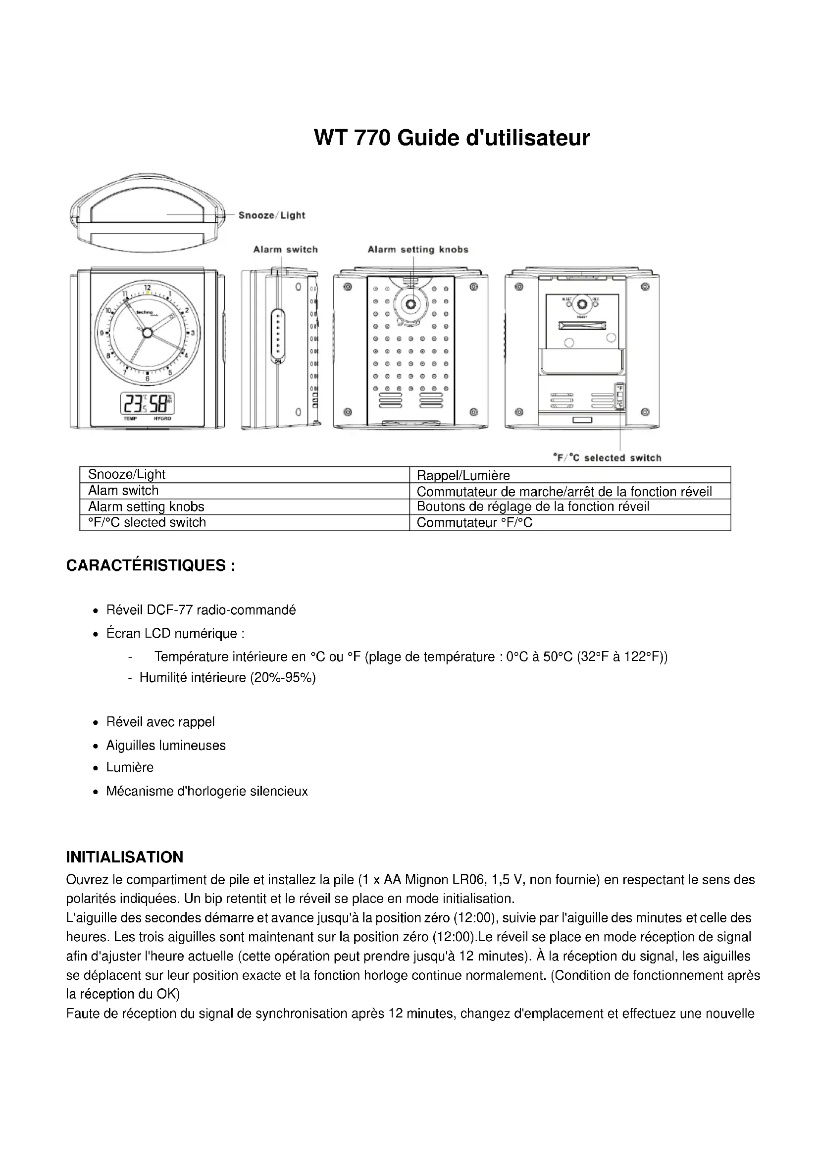 CARACTÉRISTIQUES : Réveil DCF-77 radio-commandé Écran LCD numérique : - Température intérieure en °C ou °F (plage de température : 0°C à 50°C (32°F à 122°F)) - Humilité intérieure (20%-95%) Réveil avec rappel Aiguilles lumineuses Lumière Mécanisme d'horlogerie silencieux INITIALISATION Ouvrez le compartiment de pile et installez la pile (1 x AA Mignon LR06, 1,5 V, non fournie) en respectant le sens des polarités indiquées. Un bip retentit et le réveil se place en mode initialisation. L'aiguille des secondes démarre et avance jusqu'à la position zéro (12:00), suivie par l'aiguille des minutes et celle des heures. Les trois aiguilles sont maintenant sur la position zéro (12:00).Le réveil se place en mode réception de signal afin d'ajuster l'heure actuelle (cette opération peut prendre jusqu'à 12 minutes). À la réception du signal, les aiguilles se déplacent sur leur position exacte et la fonction horloge continue normalement. (Condition de fonctionnement après la réception du OK) Faute de réception du signal de synchronisation après 12 minutes, changez d'emplacement et effectuez une nouvelletentative en appuyant sur la touche RESET. Échec de la réception du signal d'initialisation Si le réveil ne détecte pas le signal de radiocommande dans le délai de 12 minutes, ou que ce signal est de trop mauvaise qualité, il quitte le mode réception pour cependant procéder à de nouvelles tentatives à chaque changement d'heure. Réglage manuel Dans des conditions normales de fonctionnement, appuyez sur la touche M.SET et maintenez-la enfoncée pendant au moins 3 secondes. L'aiguille des secondes s'arrête et l'aiguille des minutes tourne rapidement. Le réveil se place en mode de réglage manuel. Appuyez sur la touche M-SET pour démarrer l'avance de l'aiguille des minutes. Relâchez-la dès que l'aiguille atteint sa position exacte. Chaque pression sur cette touche avance l'aiguille d'une minute. Faute d'appuyer sur la touche M.SET dans les 8 secondes, le réveil quitte le mode de réglage manuel et revient au mode horloge à partir de l'heure fixée. Réception de signal forcée Dans des conditions normales de fonctionnement, appuyez sur la touche REC. et maintenez-la enfoncée pendant au moins 3 secondes. Toutes les aiguilles démarrent puis s'arrêtent sur la position 12:00 et le réveil se place en mode réception forcée, attendant de recevoir le signal de synchronisation pendant 3-12 minutes. À la réception de ce signal, les aiguilles se déplacent sur leur position exacte et la fonction horloge continue normalement. Si le réveil ne détecte pas le signal de radiocommande dans le délai de 12 minutes, les aiguilles s'arrêtent sur la position 12:00 et l'horloge reprend son fonctionnement normal, depuis l'heure alors en vigueur juste avant la réception forcée. Réception automatique du signal radio Votre réveil reçoit automatiquement le signal radio toutes les deux heures, soit 12 fois par jour (1:00, 3:00, 5:00, ……….19:00, 21:00, 23:00). Fonction réveil Pour activer la fonction réveil, poussez son commutateur de marche/arrêt sur la position marche (ON). Lorsque l'heure de réveil est arrivée, la sonnerie retentit pendant une durée de 15 à 45 minutes et la lumière s'allume pendant 5 secondes. Pour éteindre la sonnerie avant la fin du délai fixé, poussez le commutateur de marche/arrêt du réveil sur la position arrêt (OFF). Si vous conservez le commutateur de marche/arrêt du réveil sur la position marche (ON) et appuyez simplement sur la touche Rappel, la sonnerie retentira de nouveau dans 5 minutes. Rappel/Lumière En mode de fonctionnement horloge, appuyez sur la touche Light/Snooze pour éclairer le cadran pendant 5 secondes. En mode réveil, alors que la sonnerie retentit, appuyez sur la touche Light/Snooze pour l'arrêter. Le cadran s'allume pendant 5 secondes et la sonnerie s'arrête pour reprendre 5 minutes plus tard. Sélection de l'unité d'affichage de la température : CELSIUS/FAHRENHEIT : poussez le commutateur °F/°C sur l'unité d'affichage de la température que vous désirez (ce commutateur se trouve juste à côté du compartiment de pile).Remarque : Éloignez le réveil d'au moins 1,8 m de tout appareil électrique domestique (poste de télévision, ordinateur, climatiseur, etc.). Le meilleur endroit est près d'une fenêtre.