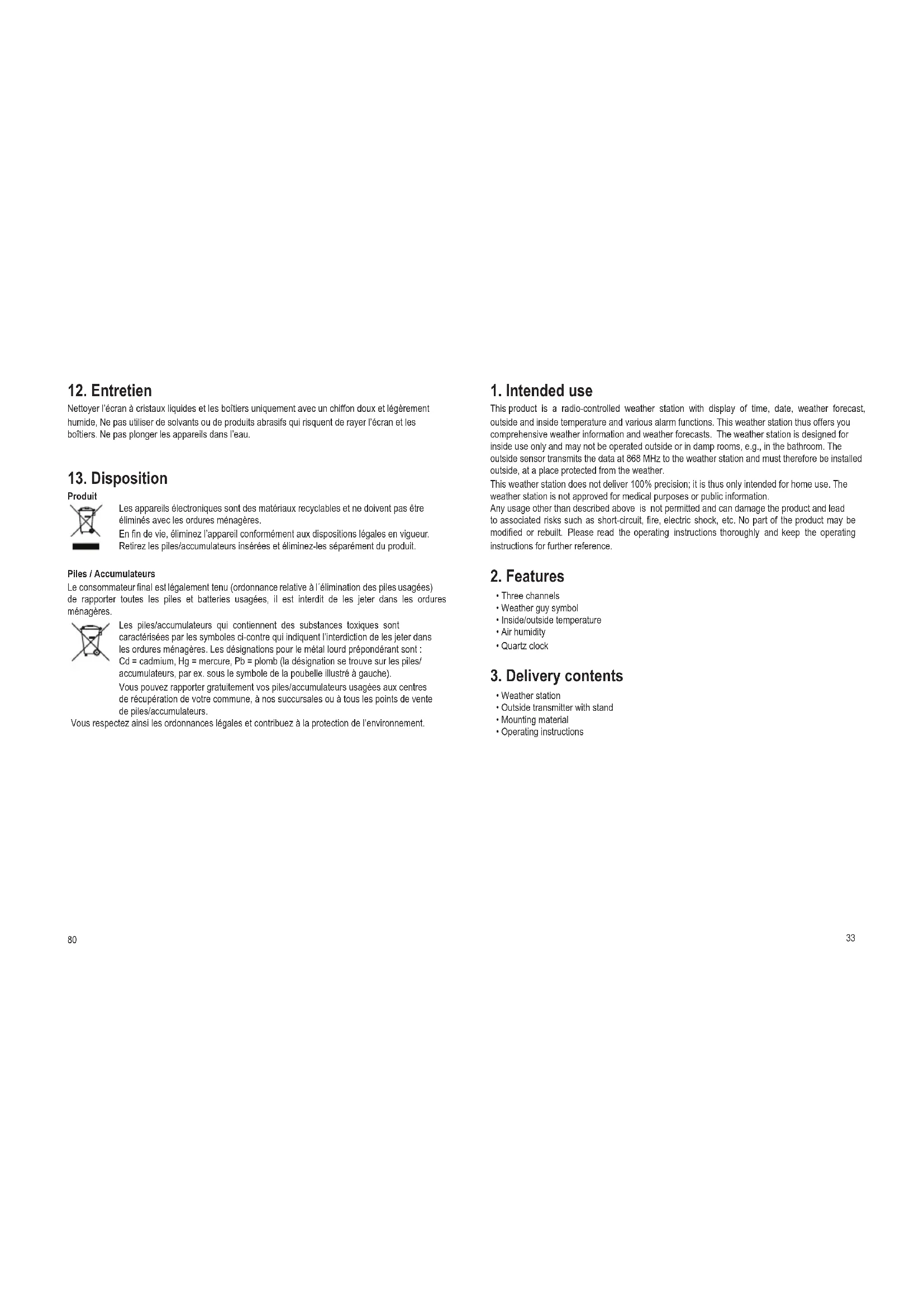Ce produit est une station météorologique contrôlée par radio et affi che l’heure, la date, les prévisions météo, les températures internes et externes ainsi que différentes fonctions d’alarme. Cette station météorologique vous fournit des informations et des prévisions météorologiques complètes. Elle a été conçue exclusivement pour un usage interne et ne peut être utilisée ni à l’extérieur ni dans les endroits humides tels que les salles de bains. Le capteur externe transmet les données via 868 MHz à la station météo. Le capteur doit donc être installé à l’extérieur et protégé des intempéries. Tout autre usage que celui spécifi é dans le mode d’emploi est interdit. Le non respect de cette règle peut entraîner la détérioration de ce produit et faire courir des risques tels que court-circuits, incendie, décharge électrique, etc. Aucune partie de ce produit ne doit être modifi é ou reconstruite. Veuillez lire attentivement le mode d’emploi et conservez-le pour vous-y référer dans le futur.
