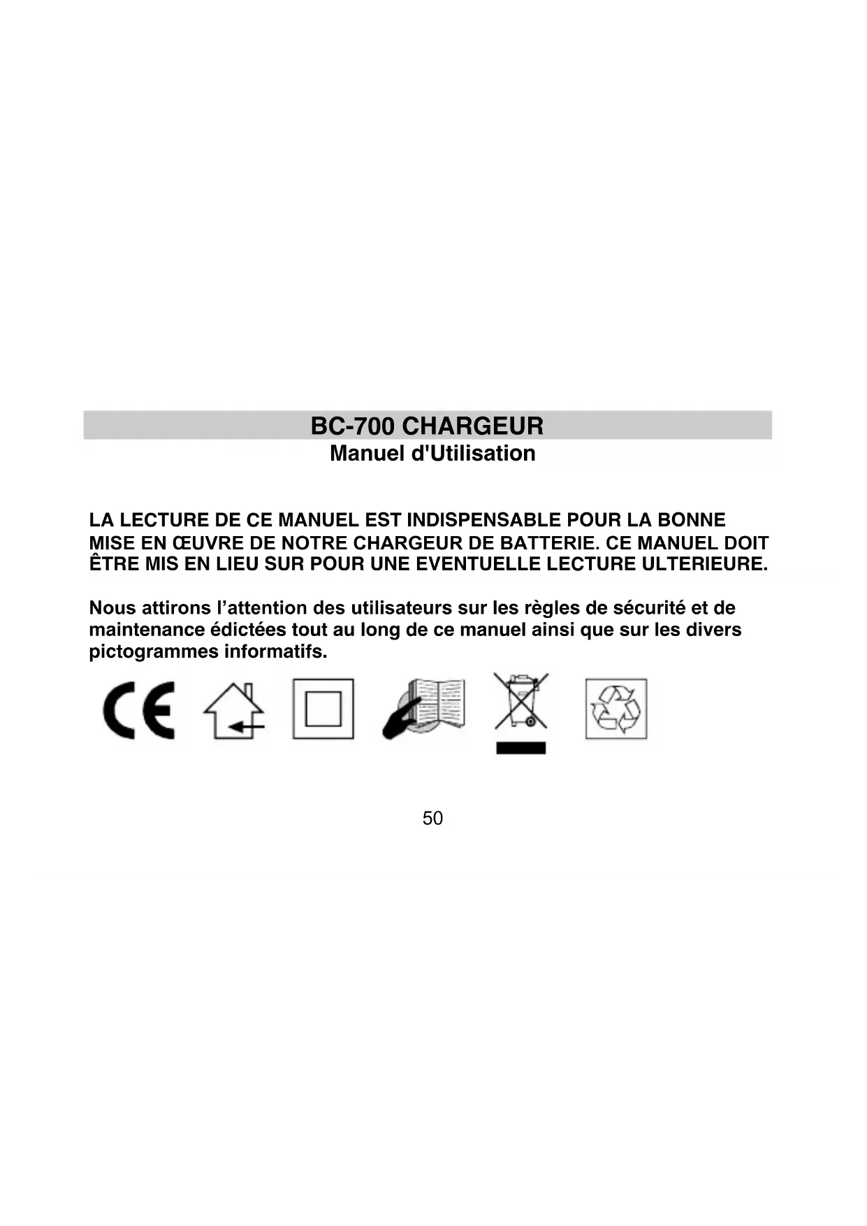 LA LECTURE DE CE MANUEL EST INDISPENSABLE POUR LA BONNE MISE EN ŒUVRE DE NOTRE CHARGEUR DE BATTERIE. CE MANUEL DOIT ÊTRE MIS EN LIEU SUR POUR UNE EVENTUELLE LECTURE ULTERIEURE. Nous attirons l’attention des utilisateurs sur les règles de sécurité et de maintenance édictées tout au long de ce manuel ainsi que sur les divers pictogrammes informatifs.51 INTRODUCTION : Nous vous félicitons d'avoir acheté le chargeur qui vous permet le chargement rapide des piles rechargeables de type “LR03” et “LR06”. Doté des fonctions de chargement, de décharge, de régénération et de vérification de capacité, ce chargeur fiable et facile d'utilisation est idéal pour la maison, le bureau ou les voyages. Il propose en plus l'affichage des fonctions sur 4 écrans LCD et 4 fonctions indépendantes sur chaque batterie branchée.