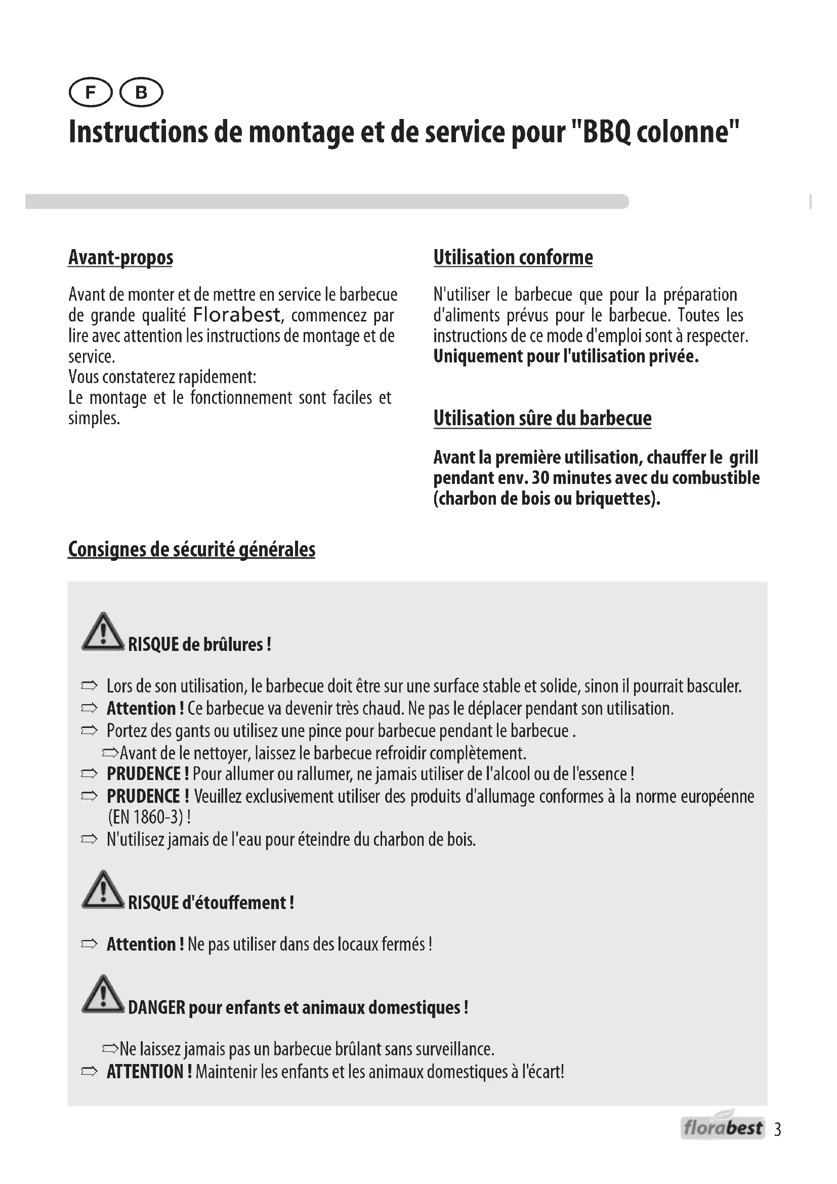 Consignes de sécurité générales Avant-propos Avant de monter et de mettre en service le barbecue de grande qualité Florabest, commencez par lire avec attention les instructions de montage et de service. Vous constaterez rapidement: Le montage et le fonctionnement sont faciles et simples. Utilisation conforme N'utiliser le barbecue que pour la préparation d'aliments prévus pour le barbecue. Toutes les instructions de ce mode d'emploi sont à respecter. Uniquement pour l'utilisation privée. Utilisation sûre du barbecue Avant la première utilisation, chauer le grill pendant env. 30 minutes avec du combustible (charbon de bois ou briquettes). RISQUE de brûlures ! ➱ Lors de son utilisation, le barbecue doit être sur une surface stable et solide, sinon il pourrait basculer. ➱ Attention ! Ce barbecue va devenir très chaud. Ne pas le déplacer pendant son utilisation. ➱ Portez des gants ou utilisez une pince pour barbecue pendant le barbecue . ➱ Avant de le nettoyer, laissez le barbecue refroidir complètement. ➱ PRUDENCE ! Pour allumer ou rallumer, ne jamais utiliser de l'alcool ou de l'essence ! ➱ PRUDENCE ! Veuillez exclusivement utiliser des produits d'allumage conformes à la norme européenne (EN 1860-3) ! ➱ N'utilisez jamais de l'eau pour éteindre du charbon de bois. RISQUE d'étouement ! ➱ Attention ! Ne pas utiliser dans des locaux fermés ! DANGER pour enfants et animaux domestiques ! ➱ Ne laissez jamais pas un barbecue brûlant sans surveillance. ➱ ATTENTION ! Maintenir les enfants et les animaux domestiques à l'écart!