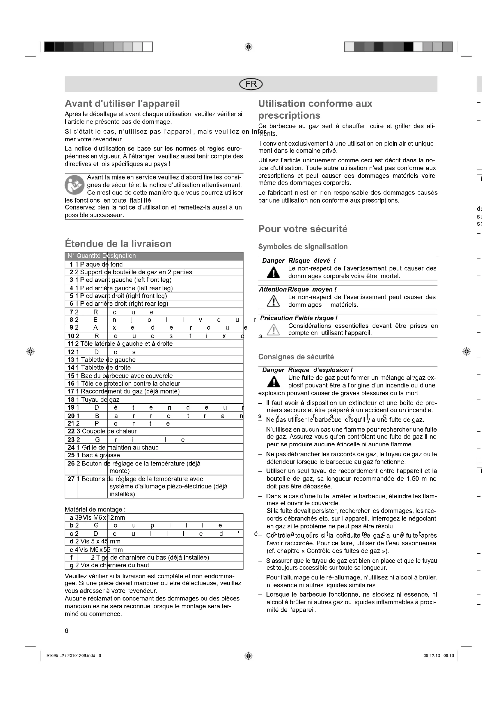 FRBE Avant d’utiliser l’appareil Après le déballage et avant chaque utilisation, veuillez vérifier si l‘article ne présente pas de dommage. Si c‘était le cas, n‘utilisez pas l‘appareil, mais veuillez en infor- mer votre revendeur. La notice d‘utilisation se base sur les normes et règles euro- péennes en vigueur. À l‘étranger, veuillez aussi tenir compte des directives et lois spécifiques au pays ! Avant la mise en service veuillez d‘abord lire les consi- gnes de sécurité et la notice d‘utilisation attentivement. Ce n‘est que de cette manière que vous pourrez utiliser les fonctions en toute fiabilité. Conservez bien la notice d‘utilisation et remettez-la aussi à un possible successeur. Étendue de la livraison N° Quantité Désignation 1 1 Plaque de fond 2 2 Support de bouteille de gaz en 2 parties 3 1 Pied avant gauche (left front leg) 4 1 Pied arrière gauche (left rear leg) 5 1 Pied avant droit (right front leg) 6 1 Pied arrière droit (right rear leg) 7 2Roue 8 2Enjoliveur 9 2Axe de roue 10 2Roues fixes 11 2 Tôle latérale à gauche et à droite 12 1Dos 13 1 Tablette de gauche 14 1 Tablette de droite 15 1 Bac du barbecue avec couvercle 16 1 Tôle de protection contre la chaleur 17 1 Raccordement du gaz (déjà monté) 18 1 Tuyau de gaz 19 1Détendeur 20 1Barre transversale 21 2Porte 22 3 Coupole de chaleur 23 2Grille 24 1 Grille de maintien au chaud 25 1 Bac à graisse 26 2 Bouton de réglage de la température (déjà monté) 27 1 Boutons de réglage de la température avec système d'allumage piézo-électrique (déjà installés) Matériel de montage : a 39 Vis M6 x 12 mm b 2Goupille c 2Douille d'écartement d 2 Vis 5 x 45 mm e 4 Vis M6 x 55 mm f 2 Tige de charnière du bas (déjà installée) g 2 Vis de charnière du haut Veuillez vérifier si la livraison est complète et non endomma- gée. Si une pièce devait manquer ou être défectueuse, veuillez vous adresser à votre revendeur. Aucune réclamation concernant des dommages ou des pièces manquantes ne sera reconnue lorsque le montage sera ter- miné ou commencé. Utilisation conforme aux prescriptions Ce barbecue au gaz sert à chauffer, cuire et griller des ali- ments. Il convient exclusivement à une utilisation en plein air et unique- ment dans le domaine privé. Utilisez l‘article uniquement comme ceci est décrit dans la no- tice d‘utilisation. Toute autre utilisation n‘est pas conforme aux prescriptions et peut causer des dommages matériels voire même des dommages corporels. Le fabricant n‘est en rien responsable des dommages causés par une utilisation non conforme aux prescriptions. Pour votre sécurité Symboles de signalisation Danger Risque éle vé ! Le non-respect de l‘aver tissement peut causer des domm ages corporels voire être mortel. Attention Ris que moyen ! Le non-respect de l‘avertissement peut causer des domm ages matériels. Précaution Faible risque ! Considérations essentielles devant être prises en compte en utilisant l‘appareil. Consignes de sécurité Danger Risque d‘explosion ! Une fuite de gaz peut former un mélange air/gaz ex- plosif pouvant être à l‘origine d‘un incendie ou d‘une explosion pouvant causer de graves blessures ou la mort. – Il faut avoir à disposition un extincteur et une boîte de pre- miers secours et être préparé à un accident ou un incendie. – Ne pas utiliser le barbecue lorsqu‘il y a une fuite de gaz. – N‘utilisez en aucun cas une flamme pour rechercher une fuite de gaz. Assurez-vous qu‘en contrôlant une fuite de gaz il ne peut se produire aucune étincelle ni aucune flamme. – Ne pas débrancher les raccords de gaz, le tuyau de gaz ou le détendeur lorsque le barbecue au gaz fonctionne. – Utiliser un seul tuyau de raccordement entre l‘appareil et la bouteille de gaz, sa longueur recommandée de 1,50 m ne doit pas être dépassée. – Dans le cas d‘une fuite, arrêter le barbecue, éteindre les flam- mes et ouvrir le couvercle. Si la fuite devait persister, rechercher les dommages, les rac- cords débranchés etc. sur l‘appareil. Interrogez le négociant en gaz si le problème ne peut pas être résolu. – Contrôler toujours si la conduite de gaz a une fuite après l‘avoir raccordée. Pour ce faire, utiliser de l‘eau savonneuse (cf. chapitre « Contrôle des fuites de gaz »). – S‘assurer que le tuyau de gaz est bien en place et que le tuyau est toujours accessible sur toute sa longueur. – Pour l‘allumage ou le ré-allumage, n‘utilisez ni alcool à brûler, ni essence ni autres liquides similaires. – Lorsque le barbecue fonctionne, ne stockez ni essence, ni alcool à brûler ni autres gaz ou liquides inflammables à proxi- mité de l‘appareil. 91695 L2 i 20101209.indd 13 91695 L2 i 20101209.indd 13