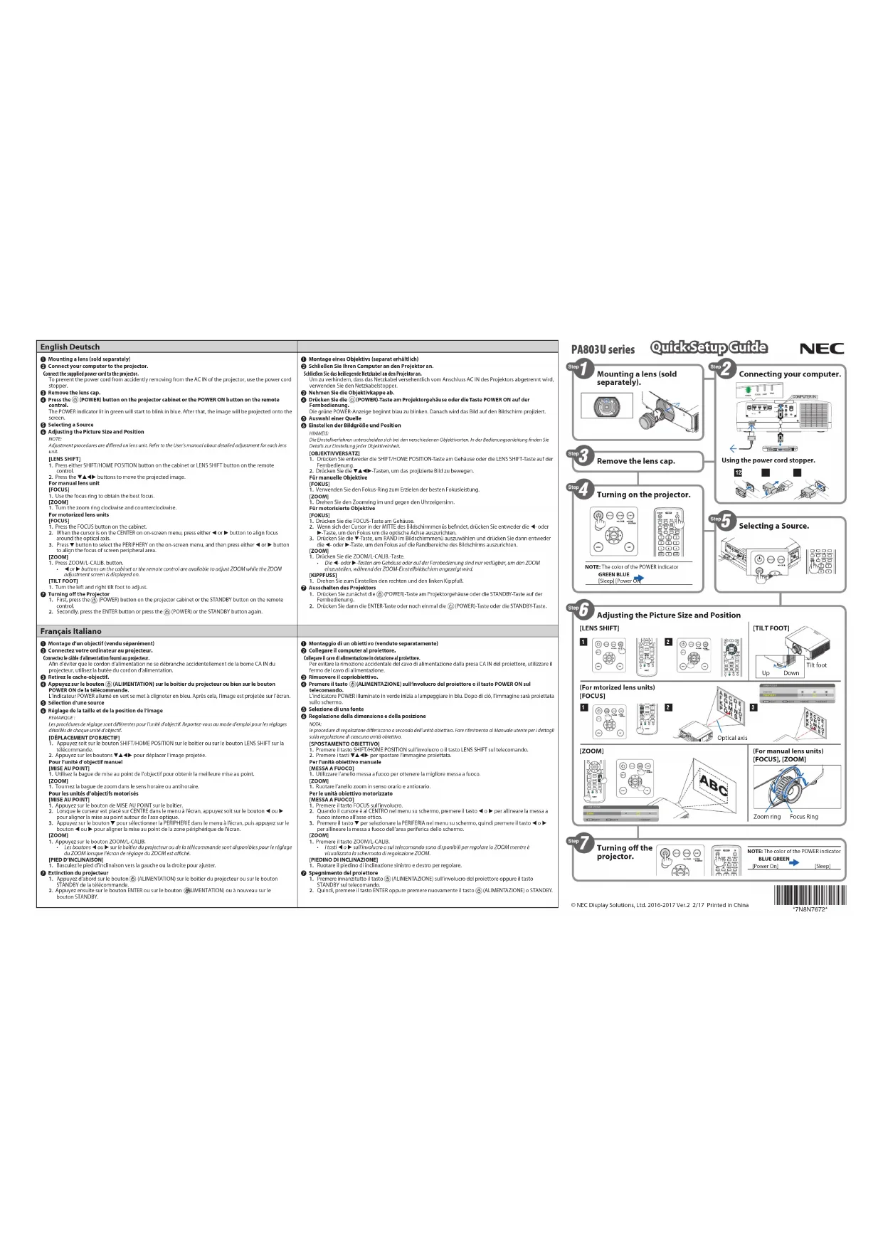 STANDBY de la télécommande. 2. Appuyez ensuite sur le bouton ENTER ou sur le bouton (ALIMENTATION) ou à nouveau sur le bouton STANDBY.❶ Montaggio di un obiettivo (venduto separatamente)❷ Collegare il computer al proiettore. Collegare il cavo di alimentazione in dotazione al proiettore.Per evitare la rimozione accidentale del cavo di alimentazione dalla presa CA IN del proiettore, utilizzare il fermo del cavo di alimentazione.❸ Rimuovere il copriobiettivo. ❹ Premere il tasto (ALIMENTAZIONE) sull’involucro del proiettore o il tasto POWER ON sul telecomando.L’indicatore POWER illuminato in verde inizia a lampeggiare in blu. Dopo di ciò, l’immagine sarà proiettata sullo schermo.❺ Selezione di una fonte❻ Regolazione della dimensione e della posizioneNOTA: le procedure di regolazione differiscono a seconda dell’unità obiettivo. Fare riferimento al Manuale utente per i dettagli sulla regolazione di ciascuna unità obiettivo.[SPOSTAMENTO OBIETTIVO]1. Premere il tasto SHIFT/HOME POSITION sull’involucro o il tasto LENS SHIFT sul telecomando.2. Premere i tasti ▼▲◀▶ per spostare l’immagine proiettata.Per l'unità obiettivo manuale[MESSA A FUOCO]1. Utilizzare l’anello messa a fuoco per ottenere la migliore messa a fuoco.[ZOOM]1. Ruotare l’anello zoom in senso orario e antiorario.Per le unità obiettivo motorizzato[MESSA A FUOCO]1. Premere il tasto FOCUS sull’involucro.