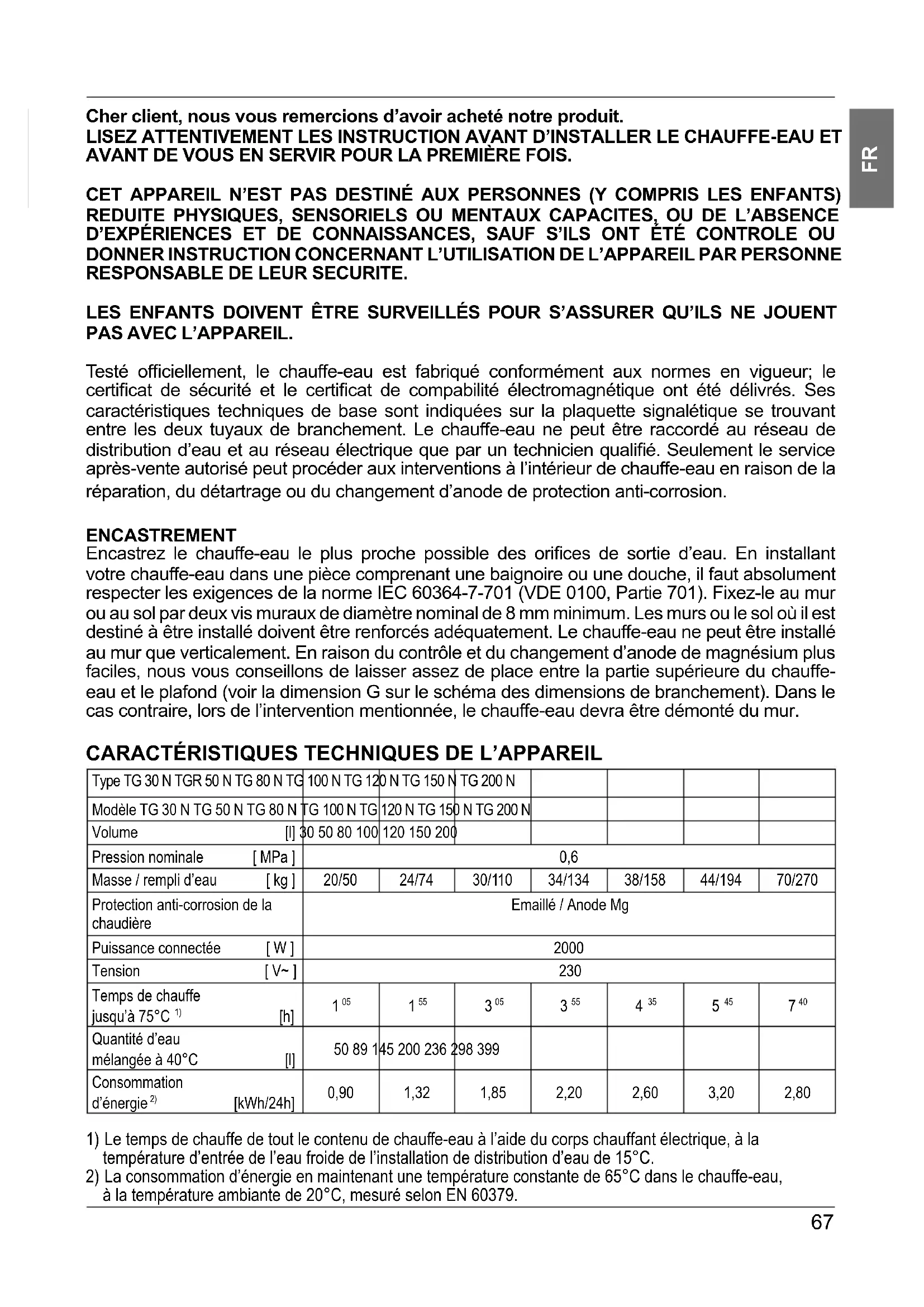 Cher client, nous vous remercions d’avoir acheté notre produit. LISEZ ATTENTIVEMENT LES INSTRUCTION AVANT D’INSTALLER LE CHAUFFE-EAU ET AVANT DE VOUS EN SERVIR POUR LA PREMIÈRE FOIS. CET APPAREIL N’EST PAS DESTINÉ AUX PERSONNES (Y COMPRIS LES ENFANTS) REDUITE PHYSIQUES, SENSORIELS OU MENTAUX CAPACITES, OU DE L’ABSENCE D’EXPÉRIENCES ET DE CONNAISSANCES, SAUF S’ILS ONT ÉTÉ CONTROLE OU DONNER INSTRUCTION CONCERNANT L’UTILISATION DE L’APPAREIL PAR PERSONNE RESPONSABLE DE LEUR SECURITE. LES ENFANTS DOIVENT ÊTRE SURVEILLÉS POUR S’ASSURER QU’ILS NE JOUENT PAS AVEC L’APPAREIL. Testé offi ciellement, le chauffe-eau est fabriqué conformément aux normes en vigueur; le certifi cat de sécurité et le certifi cat de compabilité électromagnétique ont été délivrés. Ses caractéristiques techniques de base sont indiquées sur la plaquette signalétique se trouvant entre les deux tuyaux de branchement. Le chauffe-eau ne peut être raccordé au réseau de distribution d’eau et au réseau électrique que par un technicien qualifi é. Seulement le service après-vente autorisé peut procéder aux interventions à l’intérieur de chauffe-eau en raison de la réparation, du détartrage ou du changement d’anode de protection anti-corrosion. ENCASTREMENT Encastrez le chauffe-eau le plus proche possible des orifi ces de sortie d’eau. En installant votre chauffe-eau dans une pièce comprenant une baignoire ou une douche, il faut absolument respecter les exigences de la norme IEC 60364-7-701 (VDE 0100, Partie 701). Fixez-le au mur ou au sol par deux vis muraux de diamètre nominal de 8 mm minimum. Les murs ou le sol où il est destiné à être installé doivent être renforcés adéquatement. Le chauffe-eau ne peut être installé au mur que verticalement. En raison du contrôle et du changement d’anode de magnésium plus faciles, nous vous conseillons de laisser assez de place entre la partie supérieure du chauffe- eau et le plafond (voir la dimension G sur le schéma des dimensions de branchement). Dans le cas contraire, lors de l’intervention mentionnée, le chauffe-eau devra être démonté du mur.