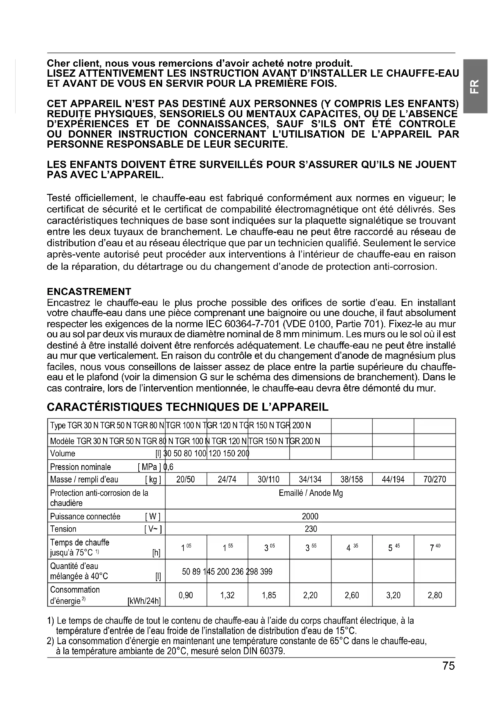 Cher client, nous vous remercions d’avoir acheté notre produit. LISEZ ATTENTIVEMENT LES INSTRUCTION AVANT D’INSTALLER LE CHAUFFE-EAU ET AVANT DE VOUS EN SERVIR POUR LA PREMIÈRE FOIS. CET APPAREIL N’EST PAS DESTINÉ AUX PERSONNES (Y COMPRIS LES ENFANTS) REDUITE PHYSIQUES, SENSORIELS OU MENTAUX CAPACITES, OU DE L’ABSENCE D’EXPÉRIENCES ET DE CONNAISSANCES, SAUF S’ILS ONT ÉTÉ CONTROLE OU DONNER INSTRUCTION CONCERNANT L’UTILISATION DE L’APPAREIL PAR PERSONNE RESPONSABLE DE LEUR SECURITE. LES ENFANTS DOIVENT ÊTRE SURVEILLÉS POUR S’ASSURER QU’ILS NE JOUENT PAS AVEC L’APPAREIL. Testé offi ciellement, le chauffe-eau est fabriqué conformément aux normes en vigueur; le certifi cat de sécurité et le certifi cat de compabilité électromagnétique ont été délivrés. Ses caractéristiques techniques de base sont indiquées sur la plaquette signalétique se trouvant entre les deux tuyaux de branchement. Le chauffe-eau ne peut être raccordé au réseau de distribution d’eau et au réseau électrique que par un technicien qualifi é. Seulement le service après-vente autorisé peut procéder aux interventions à l’intérieur de chauffe-eau en raison de la réparation, du détartrage ou du changement d’anode de protection anti-corrosion. ENCASTREMENT Encastrez le chauffe-eau le plus proche possible des orifi ces de sortie d’eau. En installant votre chauffe-eau dans une pièce comprenant une baignoire ou une douche, il faut absolument respecter les exigences de la norme IEC 60364-7-701 (VDE 0100, Partie 701). Fixez-le au mur ou au sol par deux vis muraux de diamètre nominal de 8 mm minimum. Les murs ou le sol où il est destiné à être installé doivent être renforcés adéquatement. Le chauffe-eau ne peut être installé au mur que verticalement. En raison du contrôle et du changement d’anode de magnésium plus faciles, nous vous conseillons de laisser assez de place entre la partie supérieure du chauffe- eau et le plafond (voir la dimension G sur le schéma des dimensions de branchement). Dans le cas contraire, lors de l’intervention mentionnée, le chauffe-eau devra être démonté du mur.