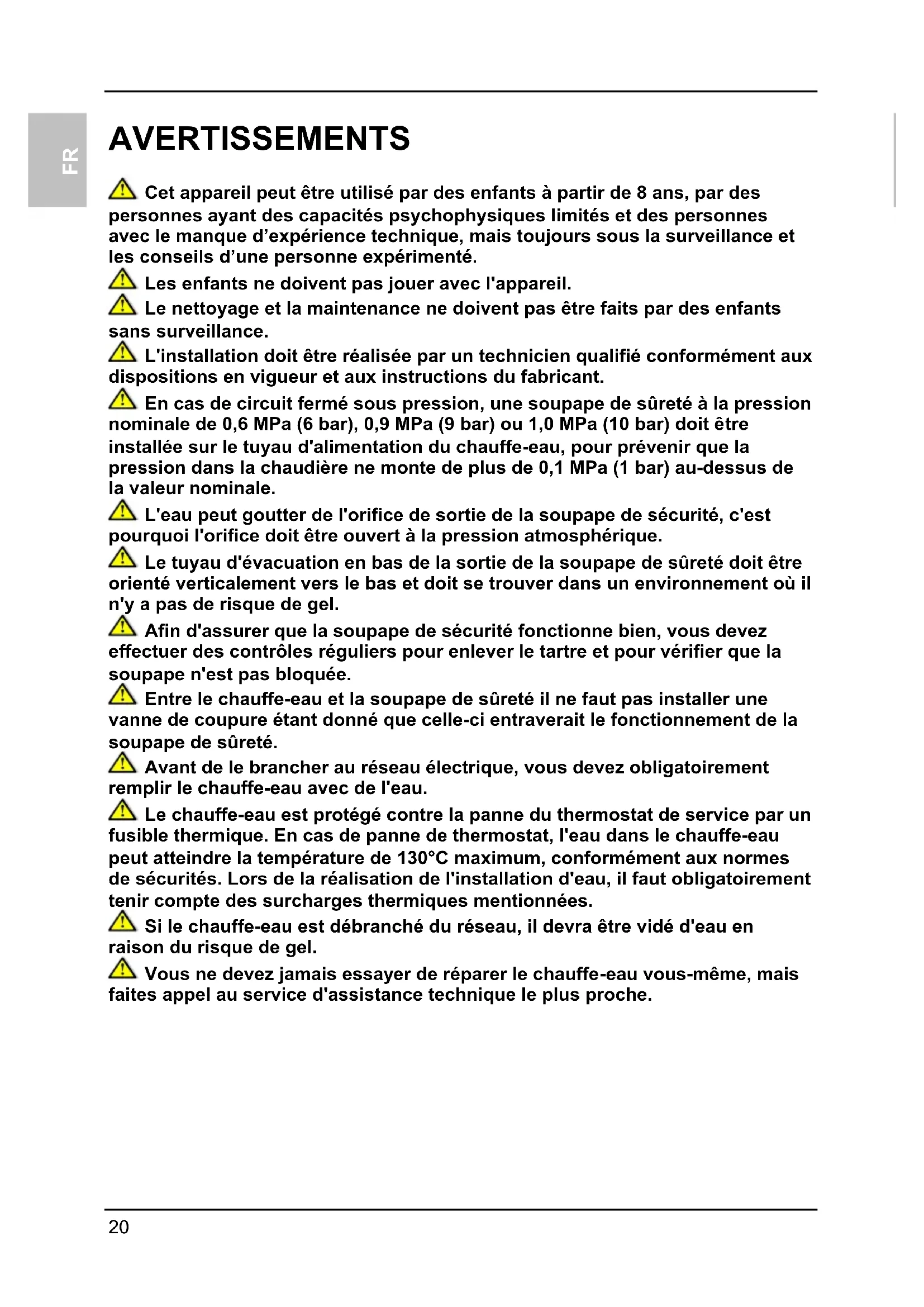 AVERTISSEMENTS Cet appareil peut être utilisé par des enfants à partir de 8 ans, par des personnes ayant des capacités psychophysiques limités et des personnes avec le manque d’expérience technique, mais toujours sous la surveillance et les conseils d’une personne expérimenté. Les enfants ne doivent pas jouer avec l'appareil. Le nettoyage et la maintenance ne doivent pas être faits par des enfants sans surveillance. L'installation doit être réalisée par un technicien qualifié conformément aux dispositions en vigueur et aux instructions du fabricant. En cas de circuit fermé sous pression, une soupape de sûreté à la pression nominale de 0,6 MPa (6 bar), 0,9 MPa (9 bar) ou 1,0 MPa (10 bar) doit être installée sur le tuyau d'alimentation du chauffe-eau, pour prévenir que la pression dans la chaudière ne monte de plus de 0,1 MPa (1 bar) au-dessus de la valeur nominale. L'eau peut goutter de l'orifice de sortie de la soupape de sécurité, c'est pourquoi l'orifice doit être ouvert à la pression atmosphérique. Le tuyau d'évacuation en bas de la sortie de la soupape de sûreté doit être orienté verticalement vers le bas et doit se trouver dans un environnement où il n'y a pas de risque de gel. Afin d'assurer que la soupape de sécurité fonctionne bien, vous devez effectuer des contrôles réguliers pour enlever le tartre et pour vérifier que la soupape n'est pas bloquée. Entre le chauffe-eau et la soupape de sûreté il ne faut pas installer une vanne de coupure étant donné que celle-ci entraverait le fonctionnement de la soupape de sûreté. Avant de le brancher au réseau électrique, vous devez obligatoirement remplir le chauffe-eau avec de l'eau. Le chauffe-eau est protégé contre la panne du thermostat de service par un fusible thermique. En cas de panne de thermostat, l'eau dans le chauffe-eau peut atteindre la température de 130°C maximum, conformément aux normes de sécurités. Lors de la réalisation de l'installation d'eau, il faut obligatoirement tenir compte des surcharges thermiques mentionnées. Si le chauffe-eau est débranché du réseau, il devra être vidé d'eau en raison du risque de gel. Vous ne devez jamais essayer de réparer le chauffe-eau vous-même, mais faites appel au service d'assistance technique le plus proche.FR