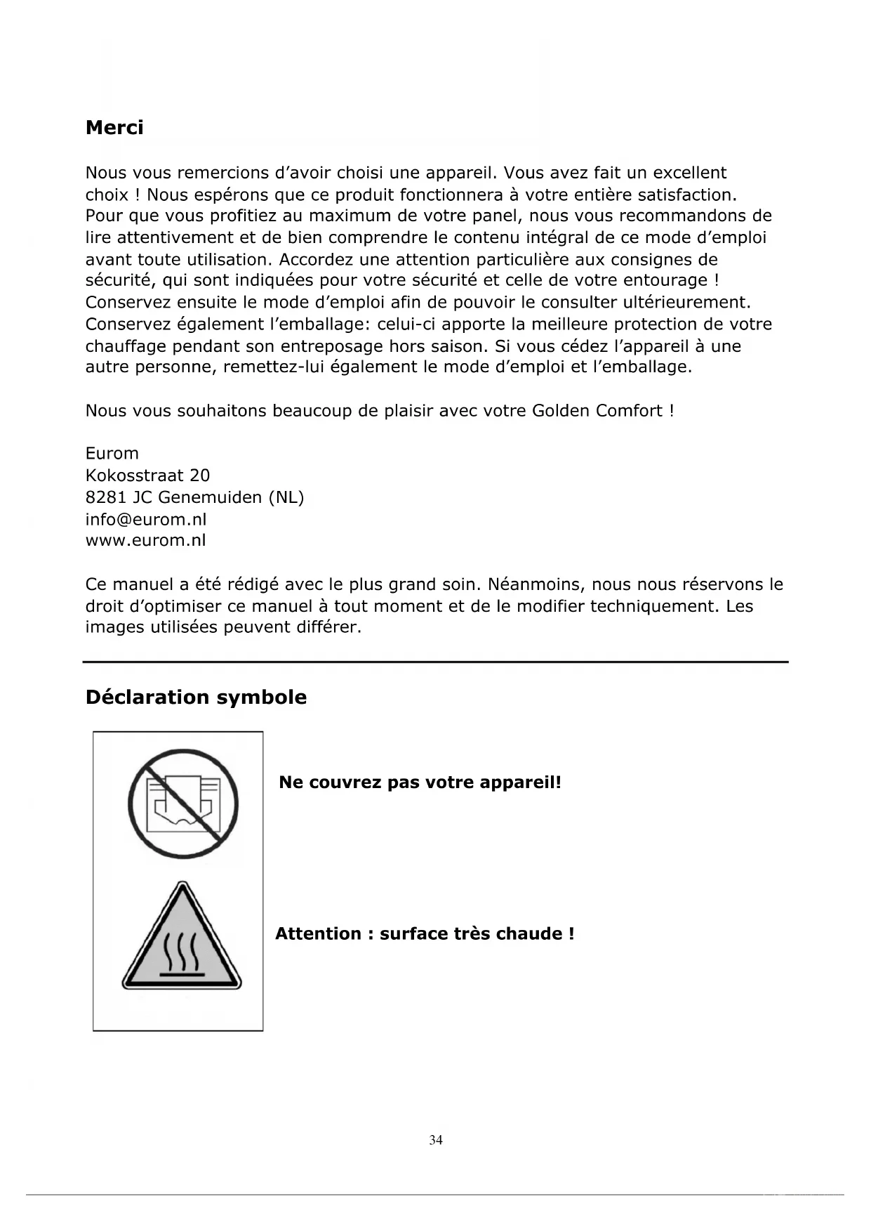 Nous vous remercions d'avoir choisi un appareil. Vous avez fait un excellent choix ! Nous espérons que ce produit fonctionnera à votre entière satisfaction. Pour que vous profitiez au maximum de votre panneau, nous vous recommandons de lire attentivement et de bien comprendre le contenu intégral de ce mode d'emploi avant toute utilisation. Accordez une attention particulière aux consignes de sécurité, qui sont indiquées pour votre sécurité et celle de votre entourage ! Conservez ensuite le mode d'emploi afin de pouvoir le consulter ultérieurement. Conservez également l'emballage : celui-ci apporte la (Meilleure) protection de votre chauffage pendant son entreposage hors saison. Si vous cédez l'appareil à une autre personne, remettez-lui également le mode d'emploi et l'emballage.