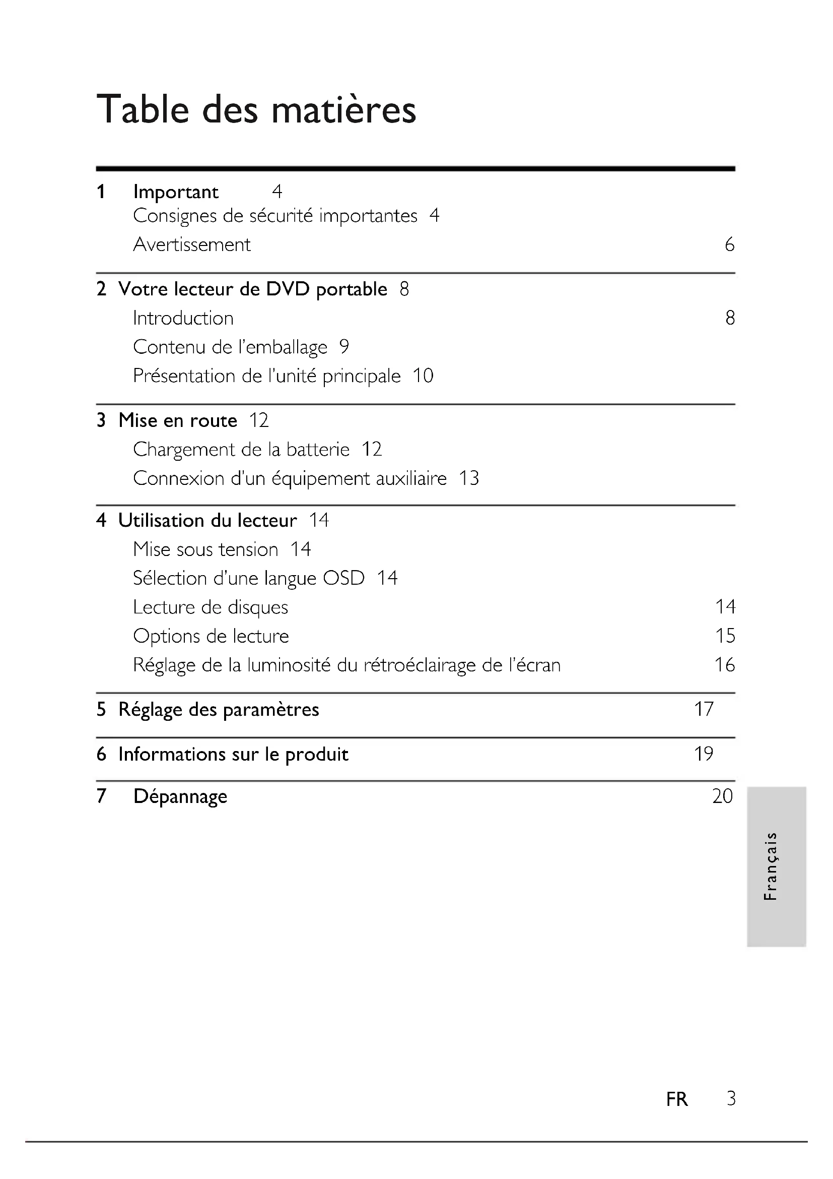 Table des matières 1 Important 4 Consignes de sécurité importantes 4 Avertissement 6 2 Votre lecteur de DVD portable 8 Introduction 8 Contenu de l’emballage 9 Présentation de l’unité principale 10 3 Mise en route 12 Chargement de la batterie 12 Connexion d’un équipement auxiliaire 13 4 Utilisation du lecteur 14 Mise sous tension 14 Sélection d’une langue OSD 14 Lecture de disques 14 Options de lecture 15 Réglage de la luminosité du rétroéclairage de l’écran 16 5 Réglage des paramètres 17 6 Informations sur le produit 19 7 Dépannage 204 1 Important Consignes de sécurité importantes