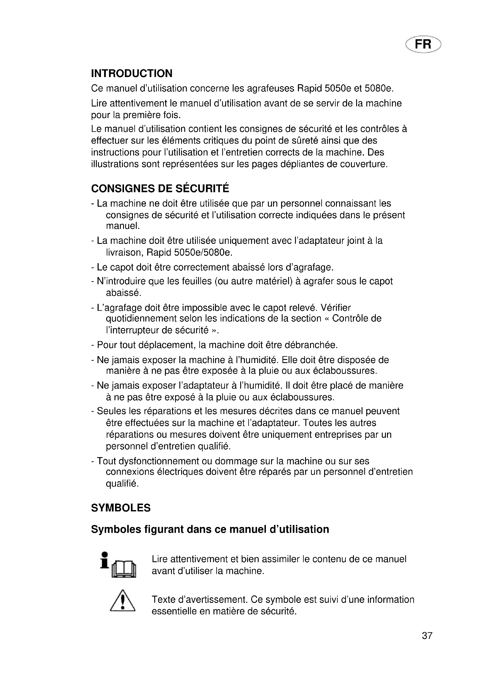 - La machine ne doit être utilisée que par un personnel connaissant les consignes de sécurité et l’utilisation correcte indiquées dans le présent manuel. - La machine doit être utilisée uniquement avec l’adaptateur joint à la livraison, Rapid 5050e/5080e. - Le capot doit être correctement abaissé lors d’agrafage. - N’introduire que les feuilles (ou autre matériel) à agrafer sous le capot abaissé. - L’agrafage doit être impossible avec le capot relevé. Vérifier quotidiennement selon les indications de la section « Contrôle de l’interrupteur de sécurité ». - Pour tout déplacement, la machine doit être débranchée. - Ne jamais exposer la machine à l’humidité. Elle doit être disposée de manière à ne pas être exposée à la pluie ou aux éclaboussures. - Ne jamais exposer l’adaptateur à l’humidité. Il doit être placé de manière à ne pas être exposé à la pluie ou aux éclaboussures. - Seules les réparations et les mesures décrites dans ce manuel peuvent être effectuées sur la machine et l’adaptateur. Toutes les autres réparations ou mesures doivent être uniquement entreprises par un personnel d’entretien qualifié. - Tout dysfonctionnement ou dommage sur la machine ou sur ses connexions électriques doivent être réparés par un personnel d’entretien qualifié. SYMBOLES Symboles figurant dans ce manuel d’utilisation Lire attentivement et bien assimiler le contenu de ce manuel avant d’utiliser la machine. Texte d’avertissement. Ce symbole est suivi d’une information essentielle en matière de sécurité. Inlaga00AA 00-06-06, 11.263738