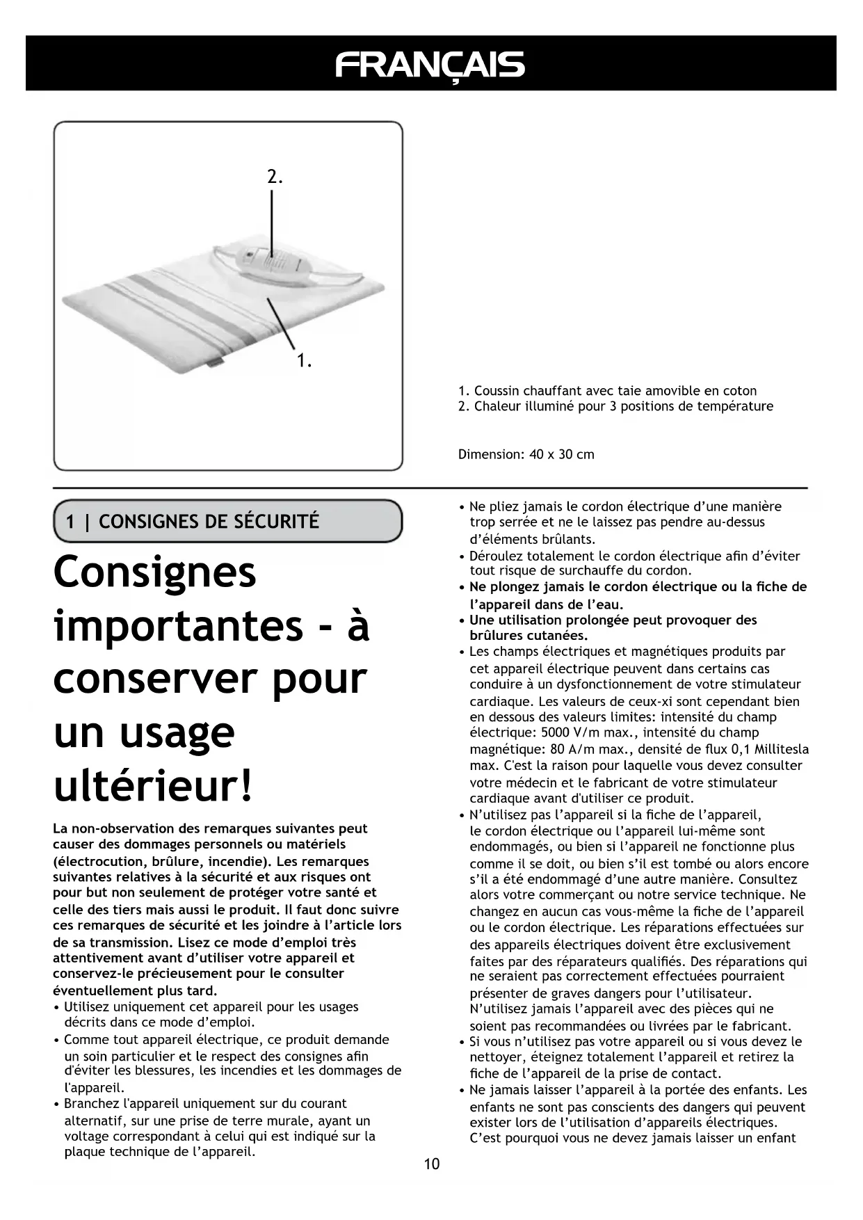 - Les champs electriques et magnétiques produits par cet apparéil électricque peuvent dans certains cas conduire à un dysfonctionnement de votre stimulator cardiaque. Les valeurs de ceux-xi sont cependant bien en dessous des valeurs limites: intense du champ électricque: 5000 V/m max., intense du champ magnétique: 80 A/m max., densité de flux 0,1 Millitesla max. C'est la raison pour laquelle vous nevez consulter votre médecin et le fabricant de votre stimulator cardiaque avant d'utiliser ce produit.
