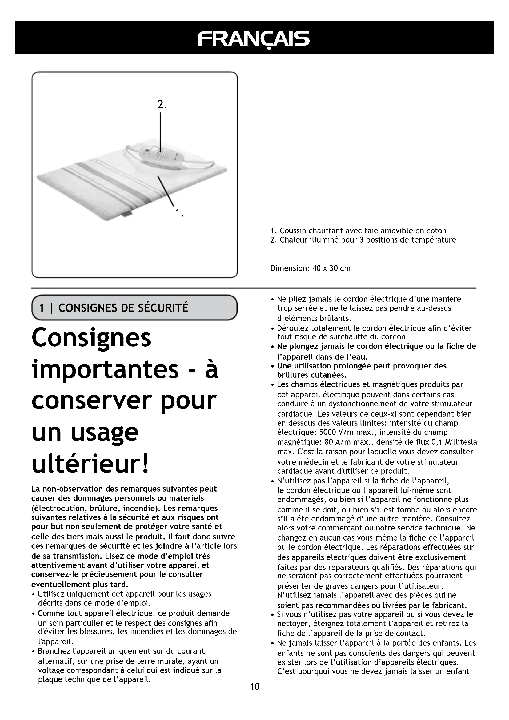 Retirez tout le matériel d'emballage et gardez-le hors de portée des enfants. Après avoir retiré l'appareil de son emballage, contrôlez minutieusement s'il n'y a pas de dommages visibles ayant peut-être été causés pendant le transport. Lisez ce mode d'emploi très attentivement avant d'utiliser votre appareil et conservez-le précieusement pour le consulter éventuellement plus tard. En ce qui concerne le coussin chauffant, ne pas allumer alors qu'il est plié, compressé ou roulé. Lorsque le coussin chauffant est allumé, veuillez respecter les instructions suivantes : aucun objet puissant ou un objet engendrant de la chaleur ne doit être posé dessus. Lors de sa première utilisation, le coussin chauffant peut dégager une odeur de matière plastique ; cette odeur disparaîtra en peu de temps.