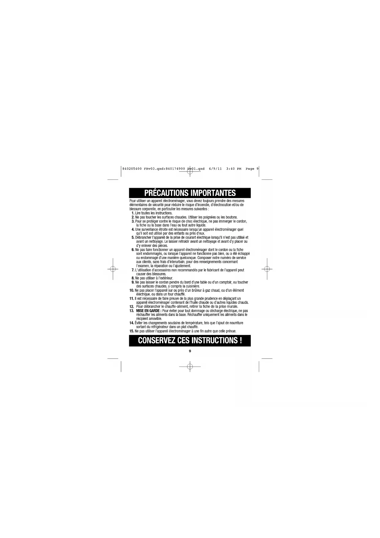 Cette garantie s’applique aux produits achetés aux É.-U. et au Canada. C’est la seule garantie expresse pour ce produit et est en lieu et place de tout autre garantie ou condition. Ce produit est garanti contre tout défaut de matériaux et de main-d’oeuvre pour une période de un (1) an à compter de la date d’achat d’origine. Au cours de cette période, votre seul recours est la réparation ou le remplace- ment de ce produit ou tout composant s’avérant défectueux, à notre gré, mais vous êtes responsable de tous les coûts liés à l’expédition du produit et le retour d’un produit ou d’un composant dans le cadre de cette garantie. Si le produit ou un composant n’est plus offert, nous le remplacerons par un produit similaire de valeur égale ou supérieure. Cette garantie ne couvre pas le verre, les filtres, l’usure d’un usage normal, l’utili- sation non conforme aux directives imprimées, ou des dommages au produit résultant d’un accident, modification, utilisation abusive ou incorrecte. Cette garantie s’applique seulement à l’acheteur original ou à la personne l’ayant reçu en cadeau. La présentation du reçu de vente d’origine comme preuve d’achat est nécessaire pour faire une réclamation au titre de cette garantie. Cette garantie s’annule si le produit est utilisé autrement que par une famille ou si l’appareil est soumis à toute tension ou forme d’onde différente des caractéristiques nominales précisées sur l’étiquette (par ex. : 120 V ~ 60 Hz). Nous excluons toutes les réclamations au titre de cette garantie pour les dommages spéciaux, consécutifs et indirects causés par la violation de garantie expresse ou implicite. Toute responsabilité est limitée au prix d’achat. Chaque garantie implicite, y compris toute garantie ou condition de qual- ité marchande ou d’adéquation à un usage particulier, est exonérée, sauf dans la mesure interdite par la loi, auquel cas la garantie ou condition est limitée à la durée de cette garantie écrite. Cette garantie vous donne des droits légaux précis. Vous pouvez avoir d’autres droits qui varient selon l’en- droit où vous habitez. Certaines provinces ne permettent pas les limitations sur les garanties implicites ou les dommages spéciaux ou indirects de telle sorte que les limitations ci-dessus ne s’appliquent peut-être pas à votre cas. Ne pas retourner cet appareil au magasin lors d’une réclamation au titre de cette garantie. Téléphoner au 1.800.851.8900 aux É.-U. ou au 1.800.267.2826 au Canada ou visiter le site internet www.proctorsilex.com aux É.-U. ou www.proctorsilex.ca au Canada. Pour un service plus rapide, trouvez le numéro de modèle, le type d’appareil et les numéros de série sur votre appareil. 840205400 FRv03.qxd:840174900 Ev01.qxd 6/9/11 3:40 PM Page 1617 ¡GUARDE ESTAS INSTRUCCIONES! SALVAGUARDIAS IMPORTANTES Cuando utilice artefactos eléctricos, siempre deben seguirse precauciones de seguridad básicas a fin de reducir el riesgo de incendio, descarga eléctrica, y/o lesiones a personas, incluyendo las siguientes: