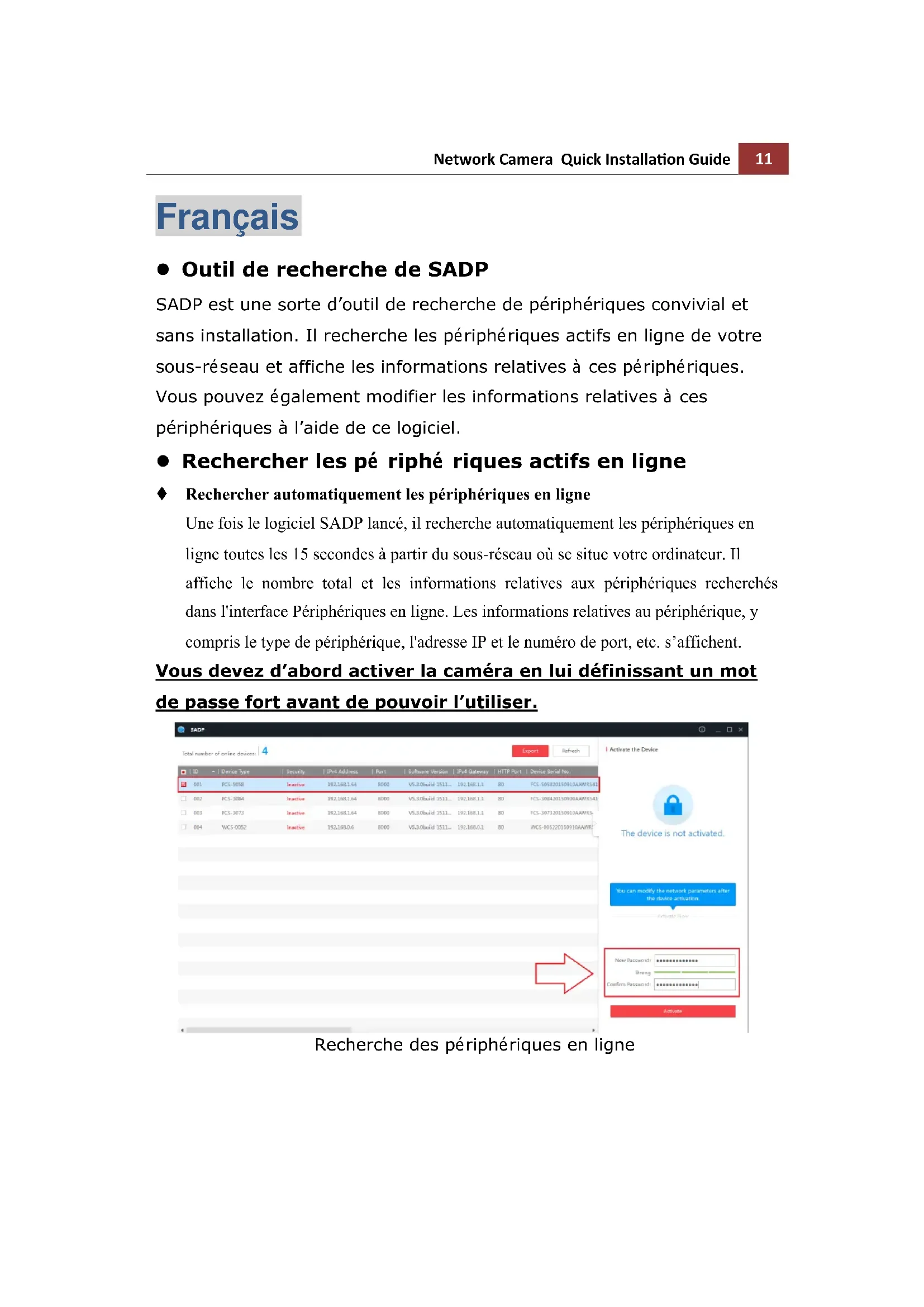 Français Outil de recherche de SADP SADP est une sorte d’outil de recherche de périphériques convivial et sans installation. Il recherche les périphériques actifs en ligne de votre sous-réseau et affiche les informations relatives à ces périphériques. Vous pouvez également modifier les informations relatives à ces périphériques à l’aide de ce logiciel. Rechercher les pé riphé riques actifs en ligne Rechercher automatiquement les périphériques en ligne Une fois le logiciel SADP lancé, il recherche automatiquement les périphériques en ligne toutes les 15 secondes à partir du sous-réseau où se situe votre ordinateur. Il affiche le nombre total et les informations relatives aux périphériques recherchés dans l'interface Périphériques en ligne. Les informations relatives au périphérique, y compris le type de périphérique, l'adresse IP et le numéro de port, etc. s’affichent. Vous devez d’abord activer la caméra en lui définissant un mot de passe fort avant de pouvoir l’utiliser. Recherche des périphériques en ligne12 Network Camera Quick Installation Guide