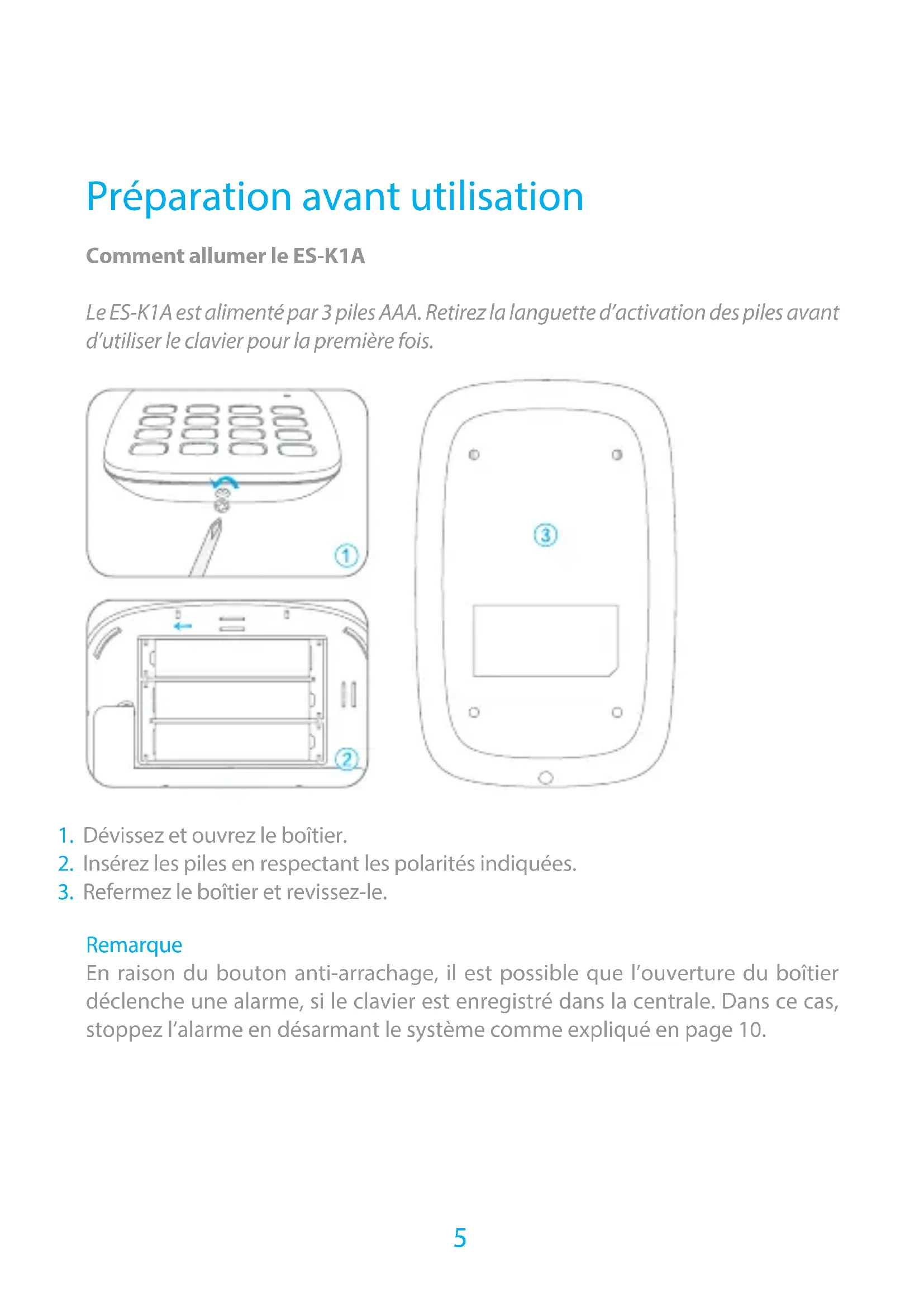 En raison du bouton anti-arrachage, il est possible que l'ouverture du boitier déclenché une alarme, si le clavier est enregistré dans la centrale. Dans ce cas, stoppez l'alarme en désarmant le système comme expliqué en page 10.