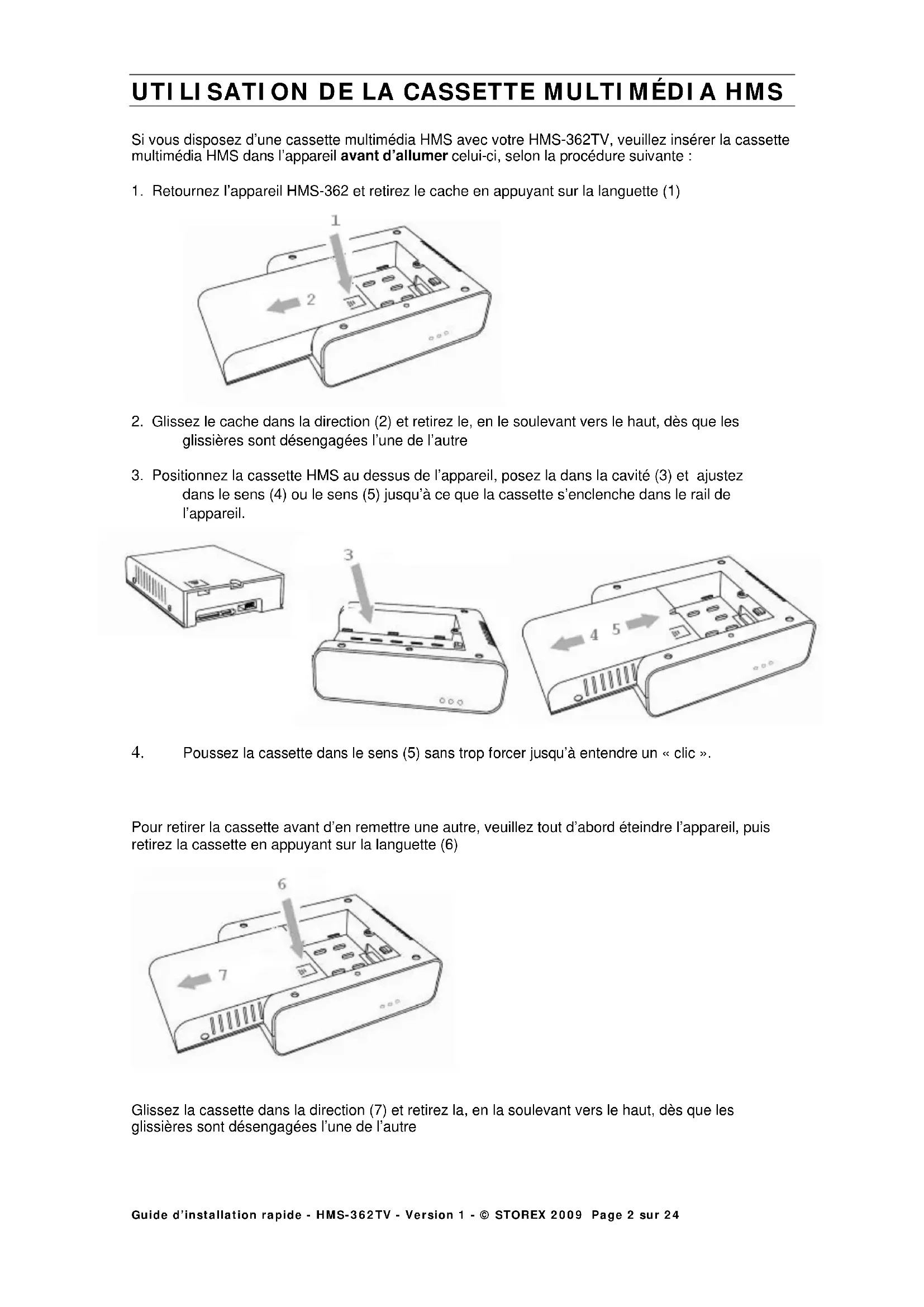 Glissez la cassette dans la direction (7) et retirez la, en la soulevant vers le haut, dès que les glissières sont désengagées l’une de l’autreGuide d’installation rapide - HMS-362TV - Version 1 - © STOREX 2009 Page 3 sur 24
