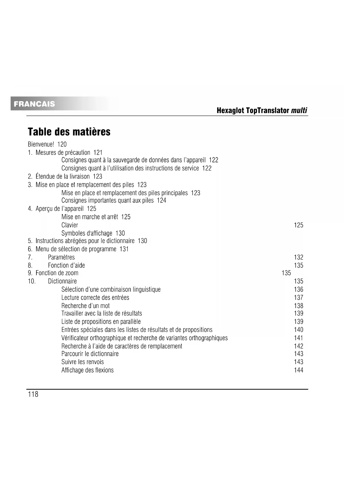 FRANCAIS Bienvenue! Nous vous remercions d’avoir opté pour l’Hexaglot TopTranslator multi. Grâce à cet appareil, vous disposez d’un dictionnaire électronique moderne et extrêmement efficace qui vous procurera assurément beaucoup de plaisir. L’Hexaglot TopTranslator multi est si pratique que vous pouvez l’emmener partout, et il vous donne un accès simple et instantané à une quantité impressionnante d’entrées, d’expressions, de traductions et de flexions de mots sélectionné(e)s et rédigé(e)s avec expérience et compétence. L’Hexaglot TopTranslator multi vous offre en outre beaucoup d’autres fonctions utiles: Le dictionnaire dispose en plus d’un registre étendu consacré aux termes gastronomiques; la plupart des entrées sont affichées avec des synonymes qui peuvent au gré être pris en compte dans la recherche; la recherche parallèle vous donne un accès instantané au mot souhaité; un dictionnaire utilisateur vous permet de saisir vos propres entrées; vous pouvez sauvegarder vos propres mémos ou adresses; un convertisseur universel efficace vous permet de convertir aisément un grand nombre d’unités; la calculette intégrée permet de résoudre des calculs; pour terminer, des jeux intégrés vous procurent un divertissement assuré pour vos trajets. Veuillez prendre le temps de lire attentivement et complètement les présentes instructions avant la toute première utilisation: vous pourrez ainsi utiliser de manière optimale toutes les fonctions de l’appareil, de manière que ce dernier vous procure de longues années de plaisir. Veuillez conserver les présentes instructions de service afin de pouvoir le cas échéant les consulter. Hexaglot vous souhaite beaucoup de succès lors de l’utilisation de votre Hexaglot TopTranslator multi!Hexaglot TopTranslator multi