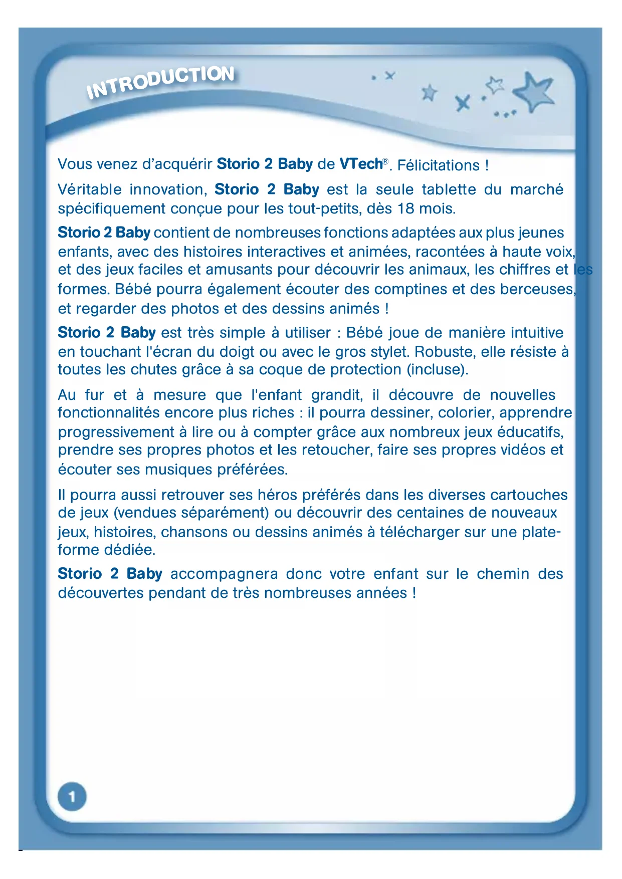 - GNU GENERAL PUBLIC LICENSE Vous venez d’acquérir Storio 2 Baby de VTech . Félicitations ! Véritable innovation, Storio 2 Baby est la seule tablette du marché spécifiquement conçue pour les tout-petits, dès 18 mois. Storio 2 Baby contient de nombreuses fonctions adaptées aux plus jeunes enfants, avec des histoires interactives et animées, racontées à haute voix, et des jeux faciles et amusants pour découvrir les animaux, les chiffres et les formes. Bébé pourra également écouter des comptines et des berceuses, et regarder des photos et des dessins animés ! Storio 2 Baby est très simple à utiliser : Bébé joue de manière intuitive en touchant l'écran du doigt ou avec le gros stylet. Robuste, elle résiste à toutes les chutes grâce à sa coque de protection (incluse).Au fur et à mesure que l'enfant grandit, il découvre de nouvelles fonctionnalités encore plus riches : il pourra dessiner, colorier, apprendre progressivement à lire ou à compter grâce aux nombreux jeux éducatifs, prendre ses propres photos et les retoucher, faire ses propres vidéos et écouter ses musiques préférées.Il pourra aussi retrouver ses héros préférés dans les diverses cartouches de jeux (vendues séparément) ou découvrir des centaines de nouveaux jeux, histoires, chansons ou dessins animés à télécharger sur une plate-forme dédiée. Storio 2 Baby accompagnera donc votre enfant sur le chemin des découvertes pendant de très nombreuses années ! p. 321
