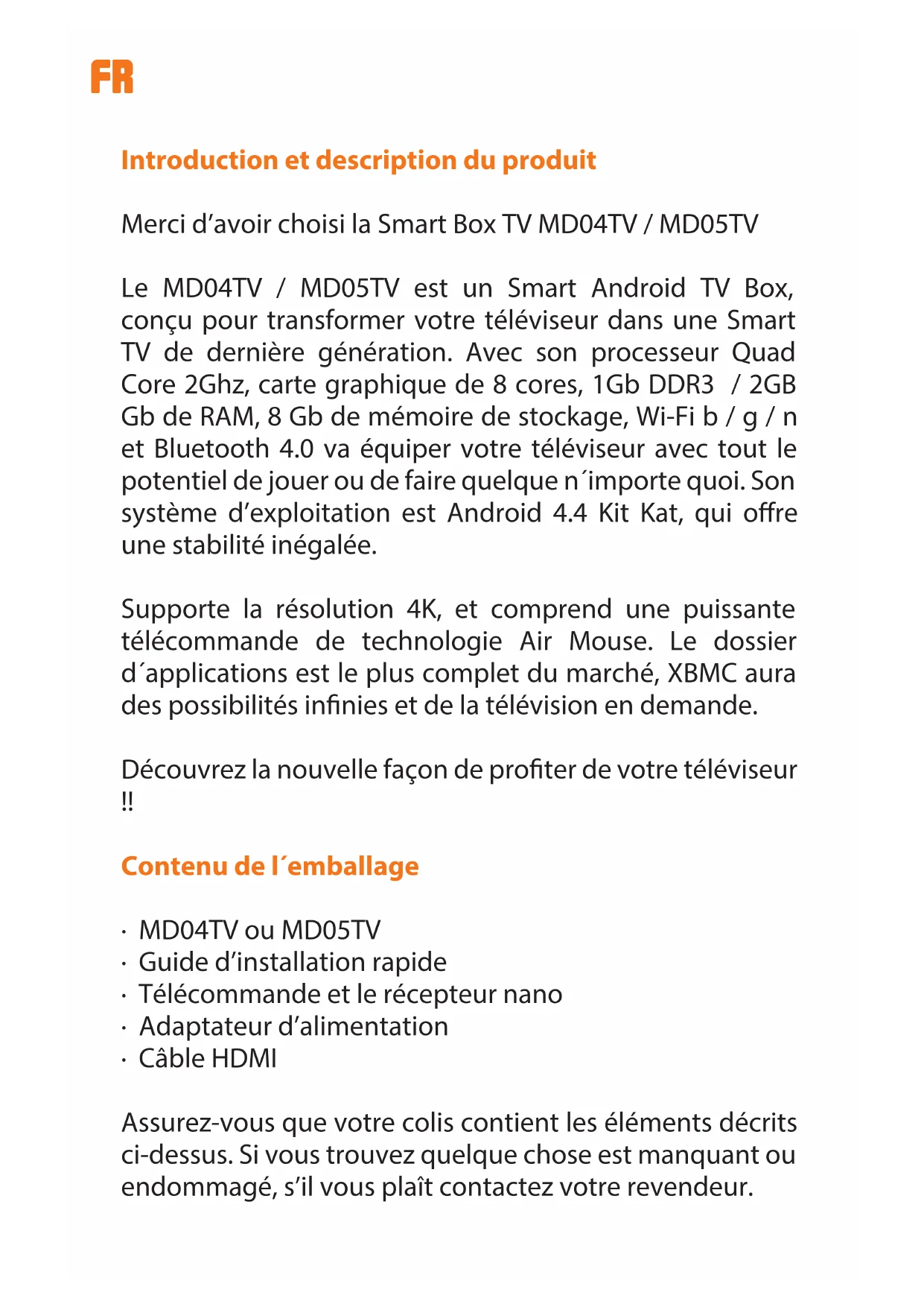 d’alimentation sur la Air Mouse (télécommande) pendant quelques secondes et pour le rallumer appuyez sur le bouton d’alimentation sur la souris Air Mouse pendant quelques secondes jusqu’à ce que le LED bleu s´allume. Écran de réglage Pour dénir la taille de l’écran de votre téléviseur, allez dans Paramètres - Position de l’écran et suivez les instructions - Achage.fr Comment ouvrir les applications Déplacez le curseur sur l’icône Poste Applications (Mes applications) et cliquez sur l’icône. Applications récemment utilisées Cliquez sur l´icl´icône pour visualiser toutes les applications.fr Vous pouvez sélectionner le souhaité pour l’amener vers l’avant. How to close applications Cliquez sur l´icône pour voir toutes les applications en cours d’exécution, choisissez l’un d’eux en cliquant et en tenue, le faire glisser vers la zone supérieure jusqu’à ce que vous fermez l’application. Déplacer entre les écrans sur le bureau Cliquez et maintenez sur le bureau, allez à droite à gauche ou pour voir les autres écrans.fr Retour à l’écran principal ou bureau Cliquez sur l´icône pour retourner à l´écran principal. Écrire Cliquez sur la case où vous voulez écrire quelque chose et le clavier virtuel sera ouvert pour saisir un texte. Connectez-vous et lire des données d´un périphérique externe 1.Branchez le disque dur externe: Branchez le disque dur externe à un port USB du MD04TV / MD05TV cliquez sur l’application FileBrowser. Le stockage “USB” sera activé.fr 2.Connectez Carte Micro SD: Branchez une carte SD dans le port SD de la MD04TV ou MD05TV ou cliquez sur l’application de navigateur. Stockage “carte SD” sera activé. Connexion WIFI Cliquez sur l’icône Paramètres et les points d’accès Wi-Fi disponibles apparaîtront dans la zone de couverture.fr Sélectionnez le réseau sans l désiré et entrez la clé d’accès pour se connecter. Connexion par câble RJ-45 Branchez le câble RJ-45 au port sur le MD04TV ou MD05TV. Appuyez sur l’icône Réglages et sélectionnez Ethernet, connectez automatiquement à votre routeur si le DHCP est activé.fr Paramètres d’achage (Display) Dans cet écran, vous pouvez régler les paramètres d’achage. Paramètres avancés (Advanced) Dans cet écran, vous pouvez dénir des options telles que Miracast, sortie audio numérique, etc.fr Autres Réglages (Other) Dans cet écran, vous pouvez dénir des options de système en appuyant sur le bouton Paramètres. Connexion Bluetooth Allez dans Paramètres - Autres - Plus Bluetooth Paramètres et changer l’interrupteur sur ON. Cliquez sur le produit désiré à droite et entrez le code PIN requis (généralement “0000” ou “1234”) pour connecter un appareil Bluetooth à l’appareil.fr Cette image montre le périphérique Bluetooth connecté. Connexion Miracast achage sans l Cliquez sur l´application “Miracast”, sélectionner l’appareil désiré et appuyez sur Connecter.fr Sur le smartphone Aller à l’achage sans l de l’interface de conguration sur votre smartphone, activer la fonction d’achage sans l et cliquez sur le nom du dispositif MD04TV / MD05TV pour se connecter. Une fois connecté, vous pouvez proter de vos lms, jeux sur la télévision.