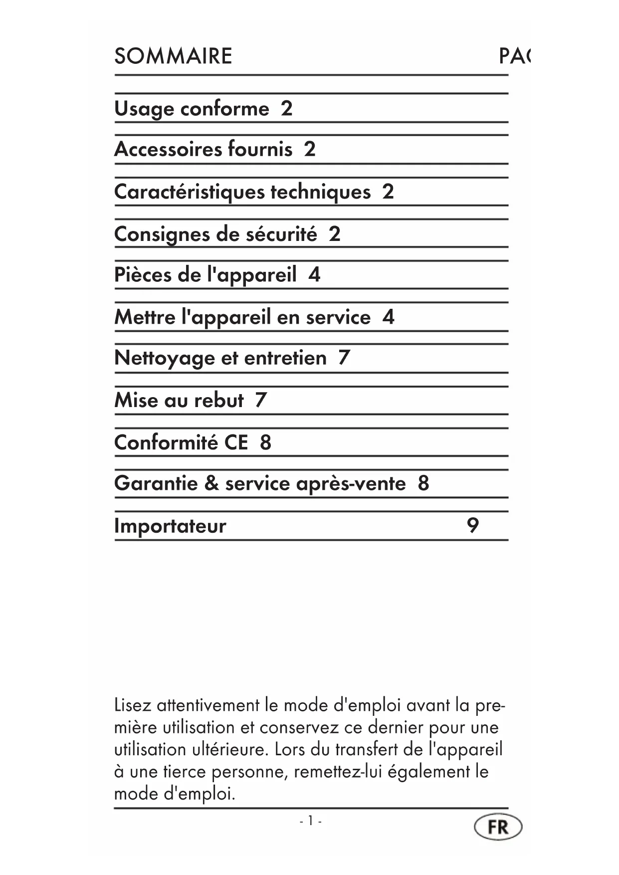 CV_KH4233_E37677_LB2.indd 5-7CV_KH4233_E37677_LB2.indd 5-7 07.10.2009 13:07:49 Uhr07.10.2009 13:07:49 Uhr- 1 - SOMMAIRE PAGE Usage conforme 2 Accessoires fournis 2 Caractéristiques techniques 2 Consignes de sécurité 2 Pièces de l'appareil 4 Mettre l'appareil en service 4 Nettoyage et entretien 7 Mise au rebut 7 Conformité CE 8 Garantie & service après-vente 8 Importateur 9 Lisez attentivement le mode d'emploi avant la pre- mière utilisation et conservez ce dernier pour une utilisation ultérieure. Lors du transfert de l'appareil à une tierce personne, remettez-lui également le mode d'emploi. Buch_E37677_LB2.indb 1Buch_E37677_LB2.indb 1 08.10.2009 11:05:35 Uhr08.10.2009 11:05:35 Uhr- 2 - Usage conforme Ce produit est destiné au nettoyage d'objets, en particulier dans les zones difficilement accessibles. Il n'est pas adapté pour l'usage commercial ou industriel ou le soin du corps. Nous déclinons toute responsabilité pour des dommages résultant d'une utilisation non conforme de l'appareil et la garan- tie est dans ce cas suspendue ! Accessoires fournis 1 entraînement de la brosse/manche 4 modules de brosse 4 piles 1 mode d'emploi Caractéristiques techniques Opération sur piles, 4 x piles de 1,5V, AA, Mignon indice de protection : IPX4 Consignes de sécurité Ne laissez jamais les enfants manipuler le pro-• duit sans surveillance – ils ne sont pas toujours capables d'évaluer les dangers et risques d'ac- cident potentiels. Ce produit n'est pas prévu pour être utilisé par • des personnes ( y compris des enfants) dont les capacités physiques, sensorielles ou mentales ou dont le manque d'expérience ou de connais- sances les empêchent d'assurer un usage sûr du produit, à moins qu'ils soient surveillés ou qu'ils aient été initiés au préalable par les personnes Buch_E37677_LB2.indb 2Buch_E37677_LB2.indb 2 08.10.2009 11:05:35 Uhr08.10.2009 11:05:35 Uhr- 3 - responsables de leur sécurité. Les enfants doi- vent être surveillés afin d'éviter qu'ils ne jouent avec l'appareil. Risque d'explosion ! Ne pas jeter les piles dans le feu ou les exposer • à des températures élevées. Il est interdit de recharger les piles ou de les • court-circuiter. Il est absolument interdit d'ouvrir les piles, de les • braser ou de les souder. Risque d'explosion et de blessures ! Remarques concernant l'utilisation des piles Vérifiez régulièrement les piles. Les fuites de • piles peuvent provoquer des dommages sur l'appareil. Lorsqu'il est nécessaire de remplacer les piles, • remplacez toujours toutes les piles en même temps et ne mélangez jamais des piles de type différent. Si vous n'utilisez pas l'appareil pendant une du-• rée prolongée, retirez les piles. En cas de fuite de piles, mettez des gants de • protection et nettoyez le compartiment à piles et les contacts des piles à l'aide d'un chiffon sec. Risque de blessures L'acide qui s'échappe d'une pile peut provoquer • des irritations cutanées. En cas de contact avec la peau, rincer abondamment à l'eau. En cas de contact entre le liquide et les yeux, éviter de frotter, rincer abondamment à l'eau et consulter immédiatement un médecin. Buch_E37677_LB2.indb 3Buch_E37677_LB2.indb 3 08.10.2009 11:05:35 Uhr08.10.2009 11:05:35 Uhr- 4 - Tenir les piles hors de portée d'enfants en bas • âge. Il y a en effet un risque de manipulation dangereuse, d'ingestion d'une pile par l'enfant, etc.. En cas d'ingestion, il faut immédiatement consulter un médecin. Pièces de l'appareil q Bride pour le module de brosse w Bouton marche/arrêt e Modules de brosse r Entraînement de la brosse/manche t Dispositif d'ouverture du compartiment à piles y Volet du compartiment à piles u Dragonne Mettre l'appareil en service Prélevez tout d'abord l'ensemble des pièces de l'appareil de l'emballage et retirez tous les maté- riaux d'emballage. Ouvrez le compartiment à piles, en appuyant > sur le dispositif d'ouverture du compartiment à piles t et retirez le volet du compartiment à piles y de l'appareil. Insérez 4 piles à 1,5V de la taille AA, Mignon, > dans le compartiment à piles, conformément au plan représenté sur la barrette de séparation dans le compartiment à piles. Refermez à nouveau le volet du compartiment > à piles y. A cet égard, les deux marquages à point sur le volet du compartiment à piles et ceux du compartiment à piles doivent reposer l'un sur l'autre. Buch_E37677_LB2.indb 4Buch_E37677_LB2.indb 4 08.10.2009 11:05:35 Uhr08.10.2009 11:05:35 Uhr- 5 - Sélectionnez un module de brosse > e adapté au degré de saleté à éliminer ainsi qu'à sa po- sition ou à son étendue :