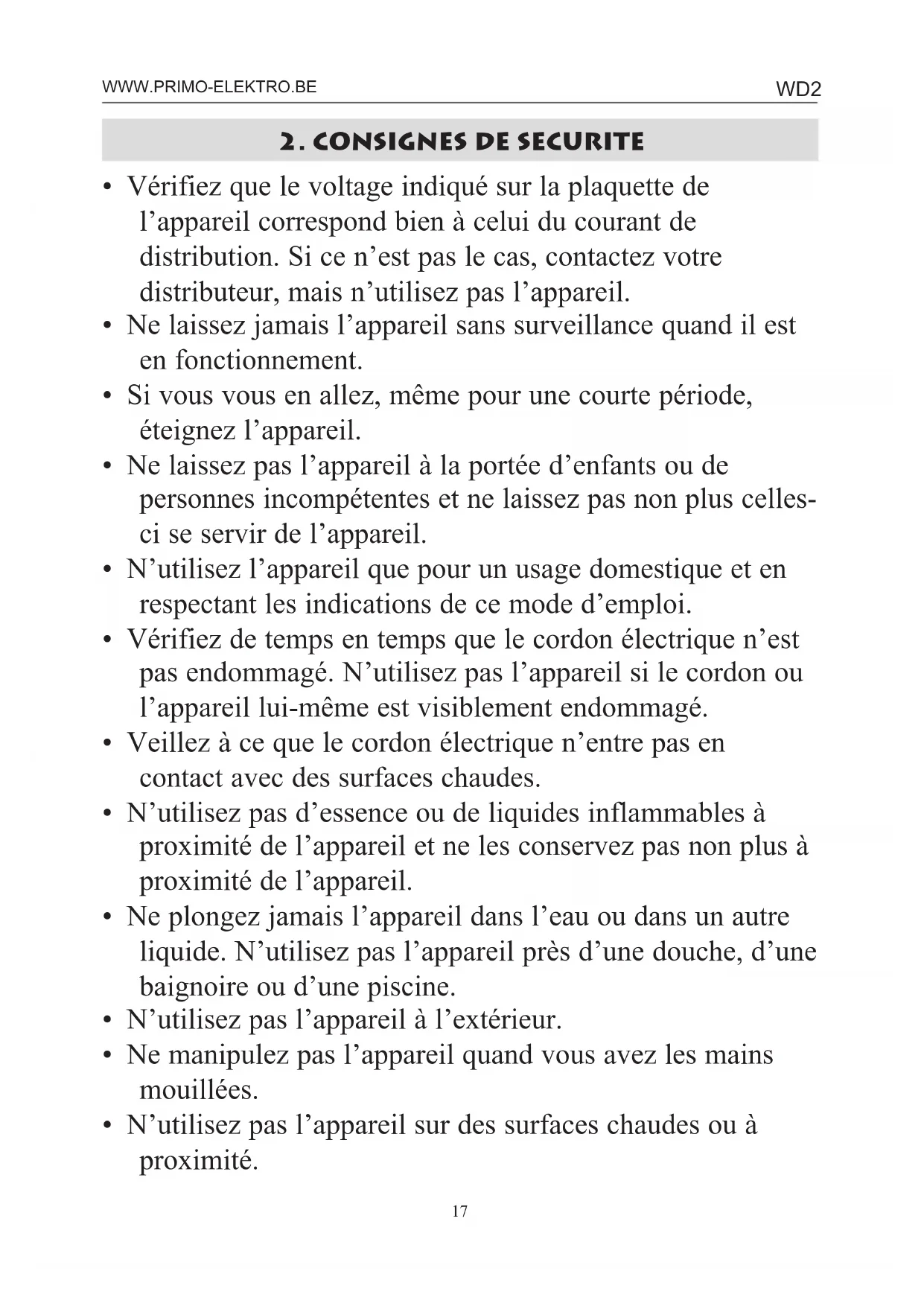 QUE FAIRE SI VOTRE APPAREIL NE FONCTIONNE PLUS ? GARANTIE : Nous accordons une garantie de 3 ans sur ce produit à partir de la date d’achat. Pendant la durée de la garantie, le distributeur prendra à sa charge la réparation des vices de fabrication ou de matériel, en se réservant le droit de décider si certaines pièces doivent être réparées ou échangées. Les dommages occasionnés par une utilisation inadéquate (branchement continu, erreur de voltage, prise inappropriée, choc, etc...), l’usure normale ne portant préjudice ni au bon fonctionnement ni à valeur de l’appareil, excluent toute prétention à la garantie. La garantie devient caduque si des réparations ont été effectuées par des personnes non agréées. La garantie est accordée sur base du ticket de caisse. ENVOYER VOTRE APPAREIL DEFECTUEUX : Si votre appareil est défaillant durant le délai de garantie de 3 ans, vous pouvez envoyer votre appareil ensemble avec votre ticket de caisse, la carte de réponse complètement et dûment rempli ou une note avec la description du défaut, vos coordonnées complètes dont votre nom, adresse et numéro de téléphone le tout GRATUITEMENT par le système « Retour Retail » de la Poste à l’adresse sous- mentionnée. PRIMO DOMPEL 9 2200 HERENTALS Vous pouvez envoyer votre appareil par le système « Retour Retail » de n’importe quel bureau de poste en Belgique. Là, vous recevrez un code barre avec lequel votre paquet sera envoyé immédiatement et gratuitement. Vous obtenez ainsi tout de suite une preuve que votre paquet a été envoyé. Autres indications ou autres mentions comme ‘port payé par le destinataire’ ne sont pas nécessaires. Veillez à ce que l’appareil soit bien emballé. Utilisez l’emballage original ou n’importe quelle autre boîte. Si le délai de garantie de 3 ans est écoulé, tous les frais sont à la charge du client. Remarquez à ce propos que les frais de port, le salaire horaire et les pièces utilisées devront être payés.WD2