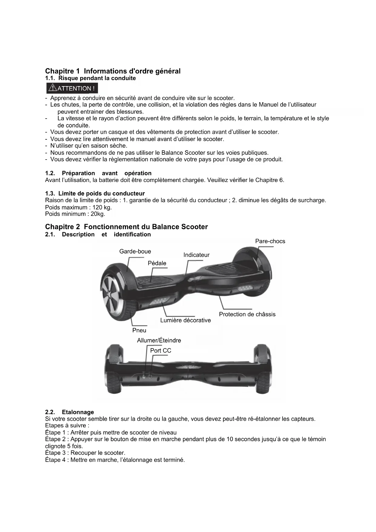 Avant de faire fonctionner ce vehicule, dire les instructions pour un assemblage et les opérations en toute sécurité. Le Manuel de l'utilisateur peut vous guider dans les fonctions et l'utilisation du Balance Scooter. Avant d'utiliser ce scooter, vous devez vous familiariser avec son fonctionnement, vous pourrez ainsi maintainir le scooter dans le meilleur état possible.