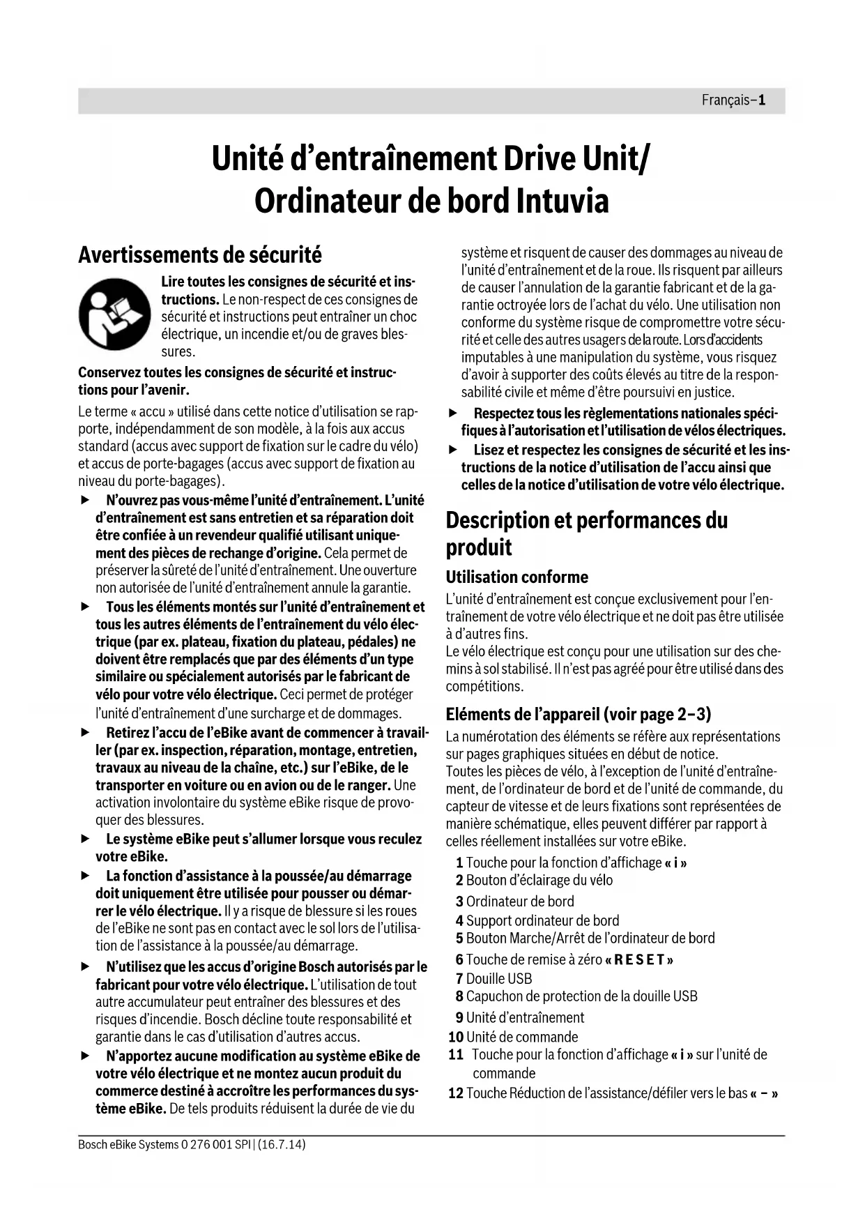 Erreur de version de logiciel Rendez-vous chez votre revendeur Bosch pour qu’il effectue une mise à jour du logiciel. Pas d’affi- chage Erreur interne de l’ordinateur de bord Redémarrez le système eBike en l’éteignant et en le rallumant. Code Cause RemèdeFrançais–8 0 276 001 SPI | (16.7.14) Bosch eBike Systems Faire les premières expériences Il est recommandé de faire les premières expériences avec le vélo électrique à l’écart de rues fortement fréquentées. Essayez les différents niveaux d’assistance à disposition. Dès que vous vous sentez sûr de vous, vous pouvez circuler avec le vélo électrique comme avec tout autre vélo. Essayez la portée de votre vélo électrique dans différentes conditions avant de planifier un parcours long et exigeant. Influences sur la portée L’autonomie est influencée par beaucoup de facteurs, tels que par exemple : – le niveau d’assistance, – la manière de changer les vitesses, – le type et la pression des pneus, – l’âge et l’état de l’accu, – le profil (montées) et les caractéristiques (surface de la route) du parcours, – le vent de face et les températures ambiantes, – le poids du vélo électrique, du conducteur et des bagages. Il n’est pour cette raison pas possible de prédire avec exacti- tude l’autonomie avant un trajet. Règles générales : –Pour une même puissance de moteur de l’entraînement du vélo électrique : Plus la force que vous devez appliquer pour atteindre une certaine vitesse sera faible (par ex. par une utilisation optimale des vitesses), plus l’énergie consommée par l’entraînement sera faible et plus grande sera l’autonomie d’une charge d’accu. –Plus le niveau d’assistance sélectionné sera élevé, même dans des conditions constantes, moins l’autonomie sera grande. Maniement soigneux du vélo électrique Respectez les températures de fonctionnement et de stoc- kage des composants de l’eBike. Protégez l’unité d’entraîne- ment, l’ordinateur de bord et l’accu des températures ex- trêmes (par exemple d’une exposition intense aux rayons du soleil sans ventilation simultanée). Les composants (notam- ment l’accu) peuvent être endommagés par une exposition à des températures extrêmes. Entretien et Service Après-Vente Nettoyage et entretien Maintenez tous les éléments de votre vélo électrique propres, surtout les contacts de l’accu et les fixations. Nettoyez-les avec précaution à l’aide d’un chiffon humidifié et doux. Ne plongez pas dans l’eau les éléments, y compris l’unité de l’entraînement et ne les nettoyez pas à l’aide d’un nettoyeur haute pression. Pour le Service Après-Vente ou des réparations sur votre vélo électrique, adressez-vous à un vélociste autorisé. Service Après-Vente et Assistance Pour toutes les questions concernant le système eBike et ses éléments, adressez-vous à un vélociste autorisé. Vous trouverez les données de contact de vélocistes autorisés sur le site internet www.bosch-ebike.com Transport Les accus sont soumis aux règlements de transport des ma- tières dangereuses. L’utilisateur peut transporter les accus in- tacts par la route sans prendre de mesures particulières. Lors d’une expédition par tiers (par ex. : transport aérien ou entreprise de transport), des prescriptions particulières en matière d’emballage et de marquage doivent être observées (par ex. les prescriptions de l’ADR). Au besoin, faire appel à un expert en transport de matières dangereuses. N’expédiez les accus que si leur boîtier n’est pas endommagé. Protégez les contacts et emballez l’accu de manière à ce qu’il ne puisse pas se déplacer dans l’emballage. Prévenez l’expé- diteur qu’il s’agit d’un produit classé comme matière dange- reuse. Veuillez également respecter les réglementations sup- plémentaires éventuellement en vigueur dans votre pays. Pour toute question concernant le transport de l’accu, adres- sez-vous à un vélociste autorisé. Vous pouvez également com- mander un emballage de transport approprié auprès d’un commerçant spécialisé. Elimination des déchets L’unité d’entraînement, l’ordinateur de bord et son unité de commande, l’accu, le capteur de vitesse, les accessoires et l’emballage doivent être triés afin d’être recyclés de façon respectueuse de l’environnement. Ne jetez pas les vélos électriques et leurs éléments dans les ordures ménagères ! Seulement pour les pays de l’Union Européenne : Conformément à la directive européenne 2012/19/UE, les équipements électriques dont on ne peut plus se servir, et conformé- ment à la directive européenne 2006/66/CE, les accus/piles usés ou dé- fectueux doivent être isolés et suivre une voie de recyclage appropriée. L’accu intégré dans l’ordinateur de bord ne doit être retiré que lorsque celui-ci doit être mis au rebut. L’ouverture de la coque du boîtier peut endommager l’ordinateur de bord. Veuillez remettre les accus qui ne sont plus utilisables et l’or- dinateur de bord à un revendeur de vélos agréé. Lithium ion : Respectez les indications données dans le chapitre « Transport », page Français–8. Sous réserve de modifications.Français–9 Bosch eBike Systems 0 276 001 SPI | (16.7.14) Accu Li-ions PowerPack Avertissements de sécurité Lire tous les avertissements de sécurité et toutes les ins- tructions. Ne pas suivre les avertissements et instructions peut donner lieu à un choc électrique, un incendie et/ou une blessure sérieuse. Conserver tous les avertissements et toutes les instruc- tions pour pouvoir s’y reporter ultérieurement. Le terme « accu » utilisé dans cette notice d’utilisation se ré- fère également aux accus standards (accus avec fixation sur le cadre de vélo) et accus de porte-bagages (accus avec fixation dans le porte-bagages), à moins que référence ne soi