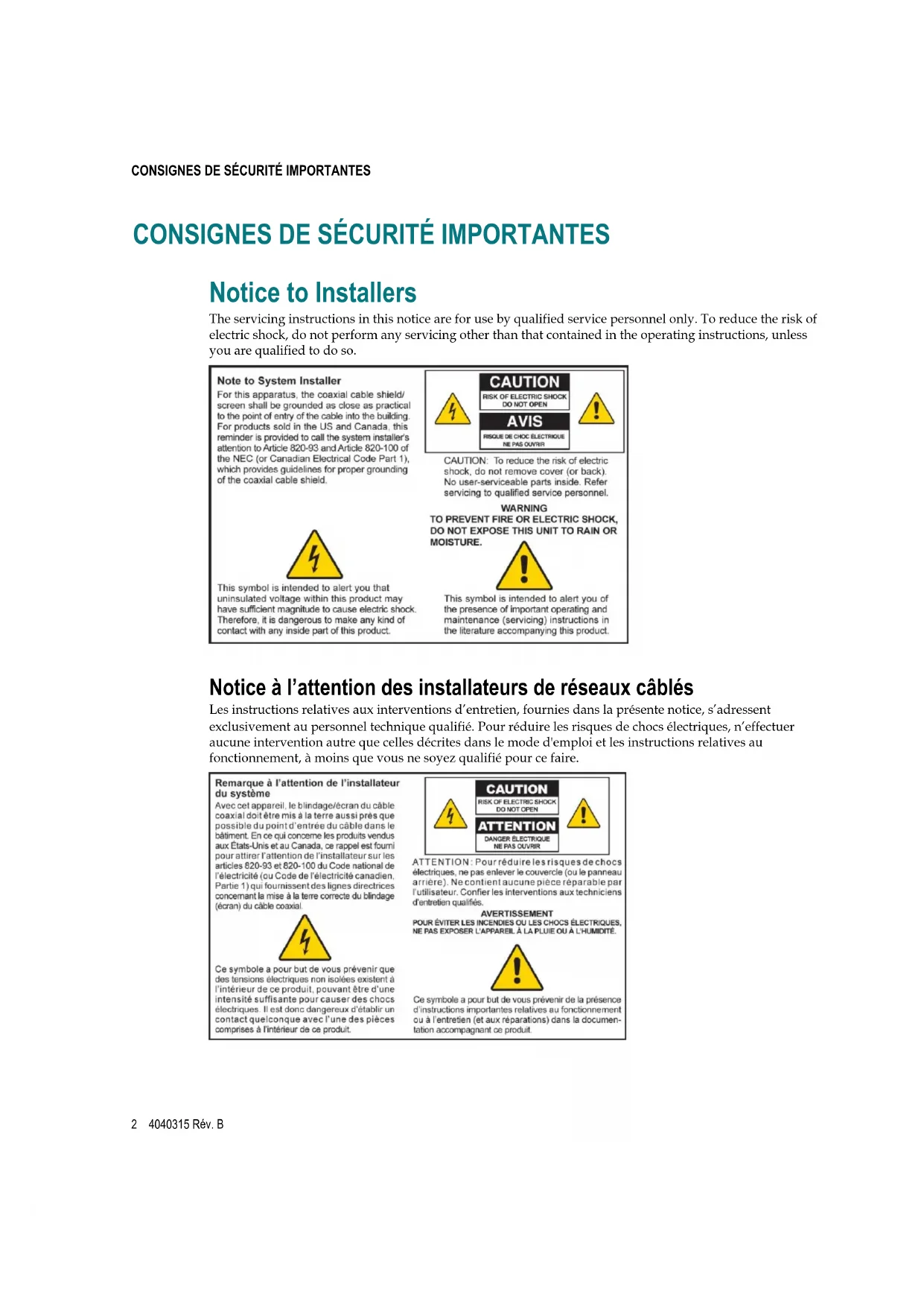 Notice to Installers The servicing instructions in this notice are for use by qualified service personnel only. To reduce the risk of electric shock, do not perform any servicing other than that contained in the operating instructions, unless you are qualified to do so. Notice à l’attention des installateurs de réseaux câblés Les instructions relatives aux interventions d’entretien, fournies dans la présente notice, s’adressent exclusivement au personnel technique qualifié. Pour réduire les risques de chocs électriques, n’effectuer aucune intervention autre que celles décrites dans le mode d'emploi et les instructions relatives au fonctionnement, à moins que vous ne soyez qualifié pour ce faire.4040315 Rév. B 3