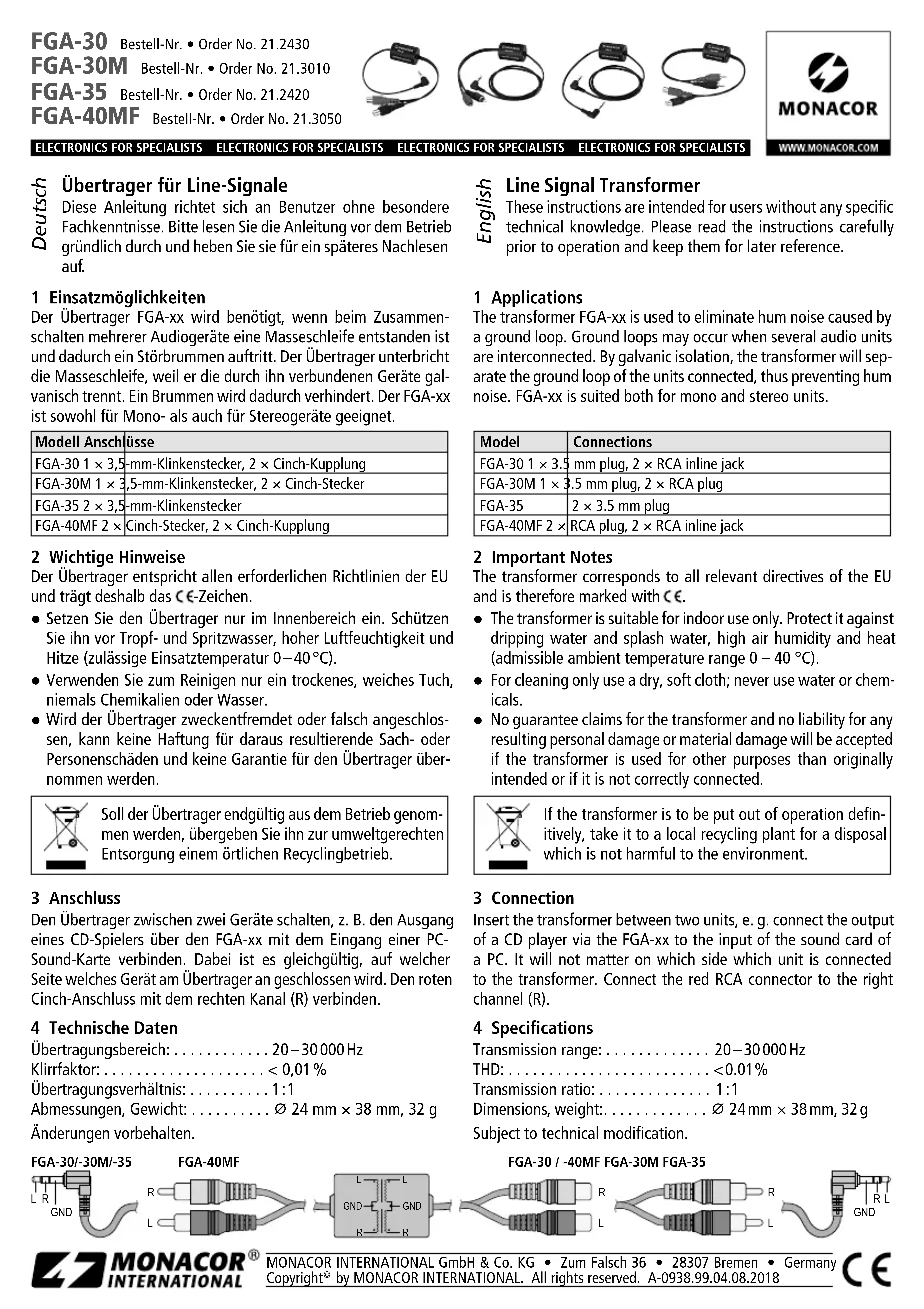Le transformateur FGA-xx est utilisé lorsque un bouglage de masse apparait si plusieurs appareils audio sont branchés ensemble, générant ainsi un ronflement. Le transformateur interrupt la boucle de masse par une isolation galvanique des appareils reliés par ce transformateur, évitant ainsi tout ronflement. Le FGA-xx est ajusté tant pour des appareils mono que stéreo.
