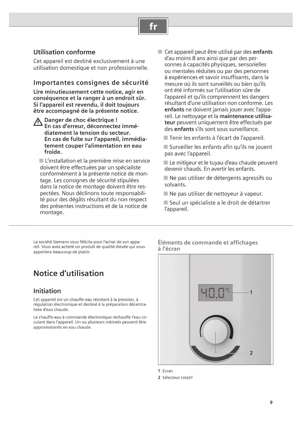 Utilisation conforme Cet appareil est destiné exclusivement à une utilisation domestique et non professionnelle. Importantes consignes de sécurité Lire minutieusement cette notice, agir en conséquence et la ranger à un endroit sûr. Si l’appareil est revendu, il doit toujours être accompagné de la présente notice. Danger de choc électrique ! En cas d’erreur, déconnectez immé- diatement la tension du secteur. En cas de fuite sur l’appareil, immédia- tement couper l’alimentation en eau froide. ■ L’installation et la première mise en service doivent être effectuées par un spécialiste conformément à la présente notice de mon- tage. Les consignes de sécurité stipulées dans la notice de montage doivent être res- pectées. Nous déclinons toute responsabili- té pour des dégâts résultant du non respect des présentes instructions et de la notice de montage. ■ Cet appareil peut être utilisé par des enfants d’au moins 8 ans ainsi que par des per- sonnes à capacités physiques, sensorielles ou mentales réduites ou par des personnes à expériences et savoir insuffisants, dans la mesure où ils sont surveillés ou bien qu’ils ont été informés sur l’utilisation sûre de l’appareil et qu’ils comprennent les dangers résultant d’une utilisation non conforme. Les enfants ne doivent jamais jouer avec l’appa- reil. Le nettoyage et la maintenance utilisa- teur peuvent uniquement être effectués par des enfants s’ils sont sous surveillance. ■ Tenir les enfants à l’écart de l’appareil. ■ Surveiller les enfants afin qu’ils ne jouent pas avec l’appareil. ■ Le mitigeur et le tuyau d’eau chaude peuvent devenir chauds. En avertir les enfants. ■ Ne pas utiliser de détergents agressifs ou solvants. ■ Ne pas utiliser de nettoyeur à vapeur. ■ Seul un spécialiste a le droit de détartrer l’appareil. La société Siemens vous félicite pour l’achat de son appa-reil. Vous avez acheté un produit de qualité élevée qui vous apportera beaucoup de plaisir. Notice d’utilisation Initiation Cet appareil est un chauffe-eau résistant à la pression, à régulation électronique et destiné à la préparation décentra-lisée d’eau chaude.Le chauffe-eau à commande électronique réchauffe l’eau cir-culant dans l’appareil. Un ou plusieurs robinets peuvent être approvisionnés en eau chaude. Éléments de commande et affichages à l’écran