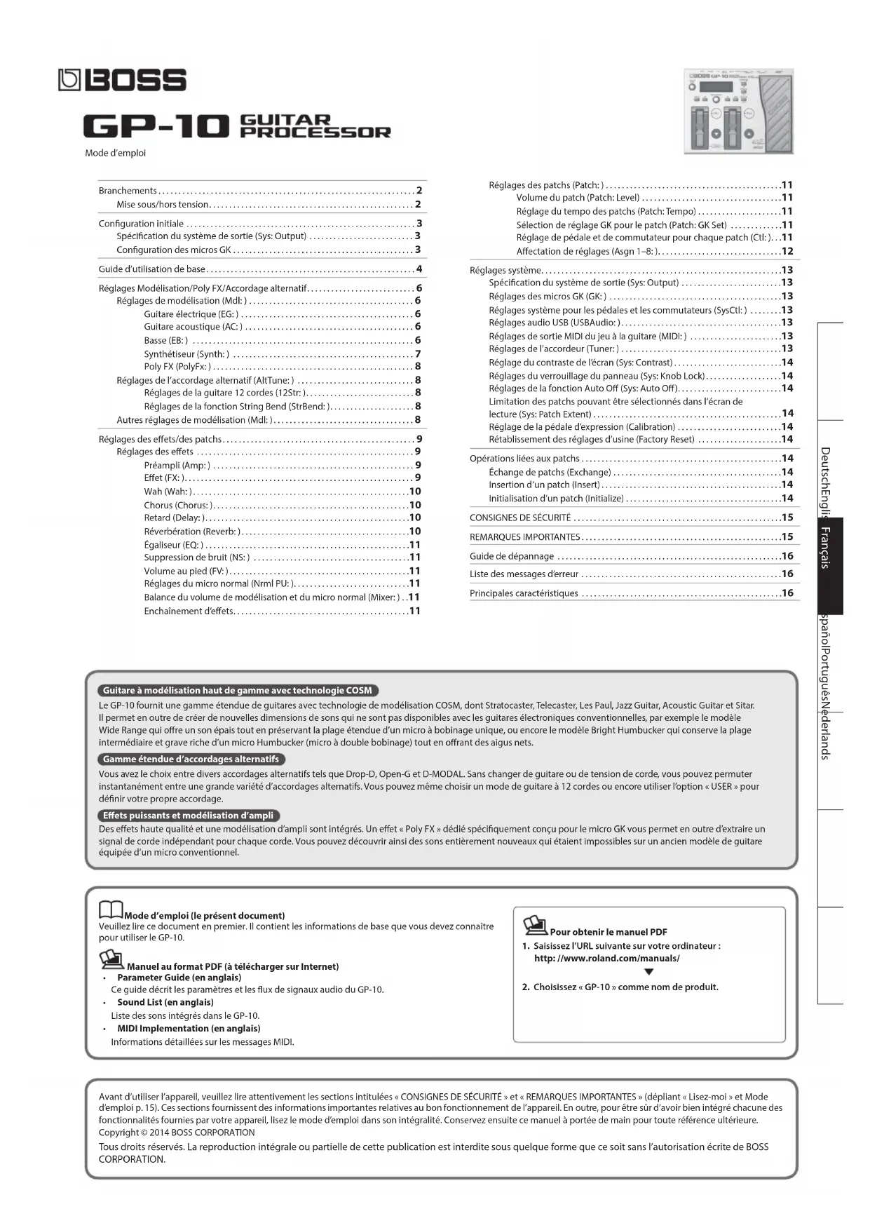 DeutschEnglish Français Italiano Español Português Nederlands Avant d’utiliser l’appareil, veuillez lire attentivement les sections intitulées «CONSIGNES DE SÉCURITÉ» et «REMARQUES IMPORTANTES» (dépliant «Lisez-moi » et Mode d’emploi p. 15). Ces sections fournissent des informations importantes relatives au bon fonctionnement de l’appareil. En outre, pour être sûr d’avoir bien intégré chacune des fonctionnalités fournies par votre appareil, lisez le mode d’emploi dans son intégralité. Conservez ensuite ce manuel à portée de main pour toute référence ultérieure. Copyright © 2014 BOSS CORPORATION Tous droits réservés. La reproduction intégrale ou partielle de cette publication est interdite sous quelque forme que ce soit sans l’autorisation écrite de BOSS CORPORATION. Mode d’emploi (le présent document) Veuillez lire ce document en premier. Il contient les informations de base que vous devez connaître pour utiliser le GP-10. Manuel au format PDF (à télécharger sur Internet)