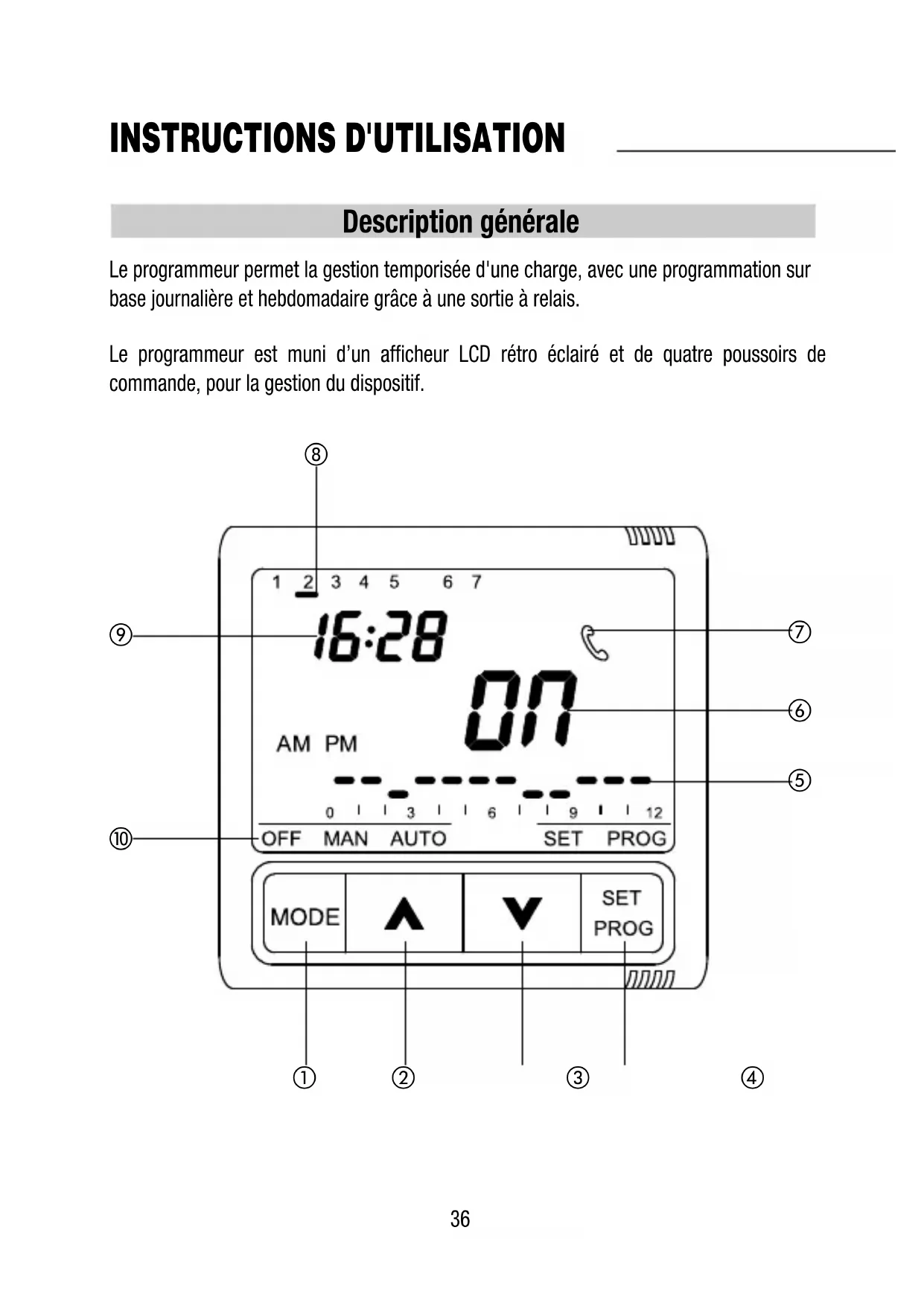 Le programmeur est muni d'un afficheur LCD rétro éclairé et de quatre poussoirs de commande, pour la gestion du dispositif.