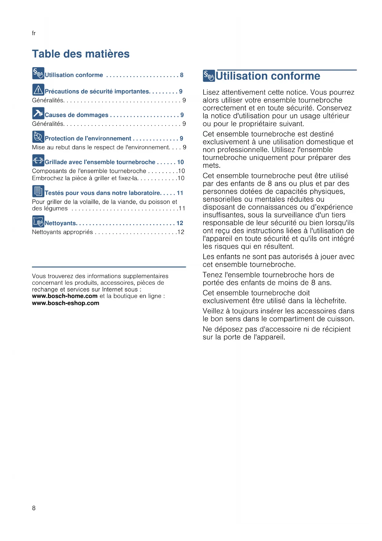 - Nettoyants appropriés Produktinfo Vous trouverez des informations supplementaires concernant les produits, accessoires, pièces de rechange et services sur Internet sous : www.bosch-home.com et la boutique en ligne : www.bosch-eshop.com 8Utilisation conforme Utilisation conforme Lisez attentivement cette notice. Vous pourrez alors utiliser votre ensemble tournebroche correctement et en toute sécurité. Conservez la notice d'utilisation pour un usage ultérieur ou pour le propriétaire suivant. Cet ensemble tournebroche est destiné exclusivement à une utilisation domestique et non professionnelle. Utilisez l'ensemble tournebroche uniquement pour préparer des mets. Cet ensemble tournebroche peut être utilisé par des enfants de 8 ans ou plus et par des personnes dotées de capacités physiques, sensorielles ou mentales réduites ou disposant de connaissances ou d’expérience insuffisantes, sous la surveillance d'un tiers responsable de leur sécurité ou bien lorsqu'ils ont reçu des instructions liées à l'utilisation de l'appareil en toute sécurité et qu'ils ont intégré les risques qui en résultent. Les enfants ne sont pas autorisés à jouer avec cet ensemble tournebroche. Tenez l'ensemble tournebroche hors de portée des enfants de moins de 8 ans. Cet ensemble tournebroche doit exclusivement être utilisé dans la lèchefrite. Veillez à toujours insérer les accessoires dans le bon sens dans le compartiment de cuisson. Ne déposez pas d'accessoire ni de récipient sur la porte de l'appareil.Précautions de sécurité importantes fr p. 12