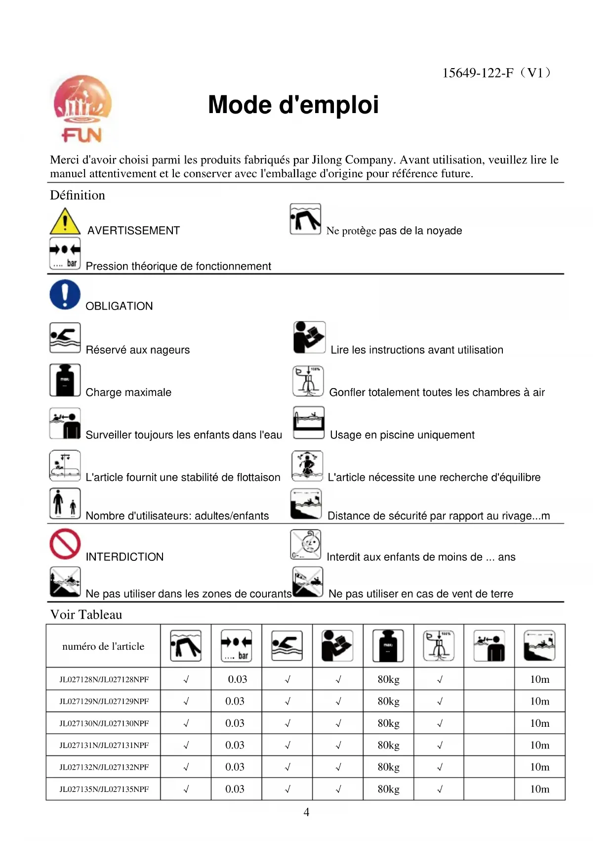 for the children. Repair Patch Instructions (Small pinhole and small puncture leaks can be repaired with the included repair patch) a) Locate the leak place. b) Deflate the air. c) Clean the area surrounding the leakage and wipe up all water from the surface. d) Take out the repair patch, cut it into required shape and size, which should be litter larger than the leaking area, put the patch on leaking area and press firmly. e) You can use it again after 24 hours drying of the repaired position. If the damage is bigger than 1” (2.5cm), we recommend using a Silicone or rubber based glue for repair. Please read warning statement on glue prior to use. Shanghai Jilong Plastic Products Co. Ltd. No. 460 Lanxue Road, Huanglou, Pudong Area, Shanghai, 201205, P.R. China Tel: +86-21-58942200 E-mail: info@jilong.com Web: www.jilong.com4 Merci d'avoir choisi parmi les produits fabriqués par Jilong Company. Avant utilisation, veuillez lire le manuel attentivement et le conserver avec l'emballage d'origine pour référence future. Définition AVERTISSEMENT Ne protège pas de la noyade Pression théorique de fonctionnement OBLIGATION Réservé aux nageurs Lire les instructions avant utilisation Charge maximale Gonfler totalement toutes les chambres à air Surveiller toujours les enfants dans l'eau Usage en piscine uniquement L'article fournit une stabilité de flottaison L'article nécessite une recherche d'équilibre Nombre d'utilisateurs: adultes/enfants Distance de sécurité par rapport au rivage...m INTERDICTION Interdit aux enfants de moins de ... ans Ne pas utiliser dans les zones de courants Ne pas utiliser en cas de vent de terre Voir Tableau numéro de l'article