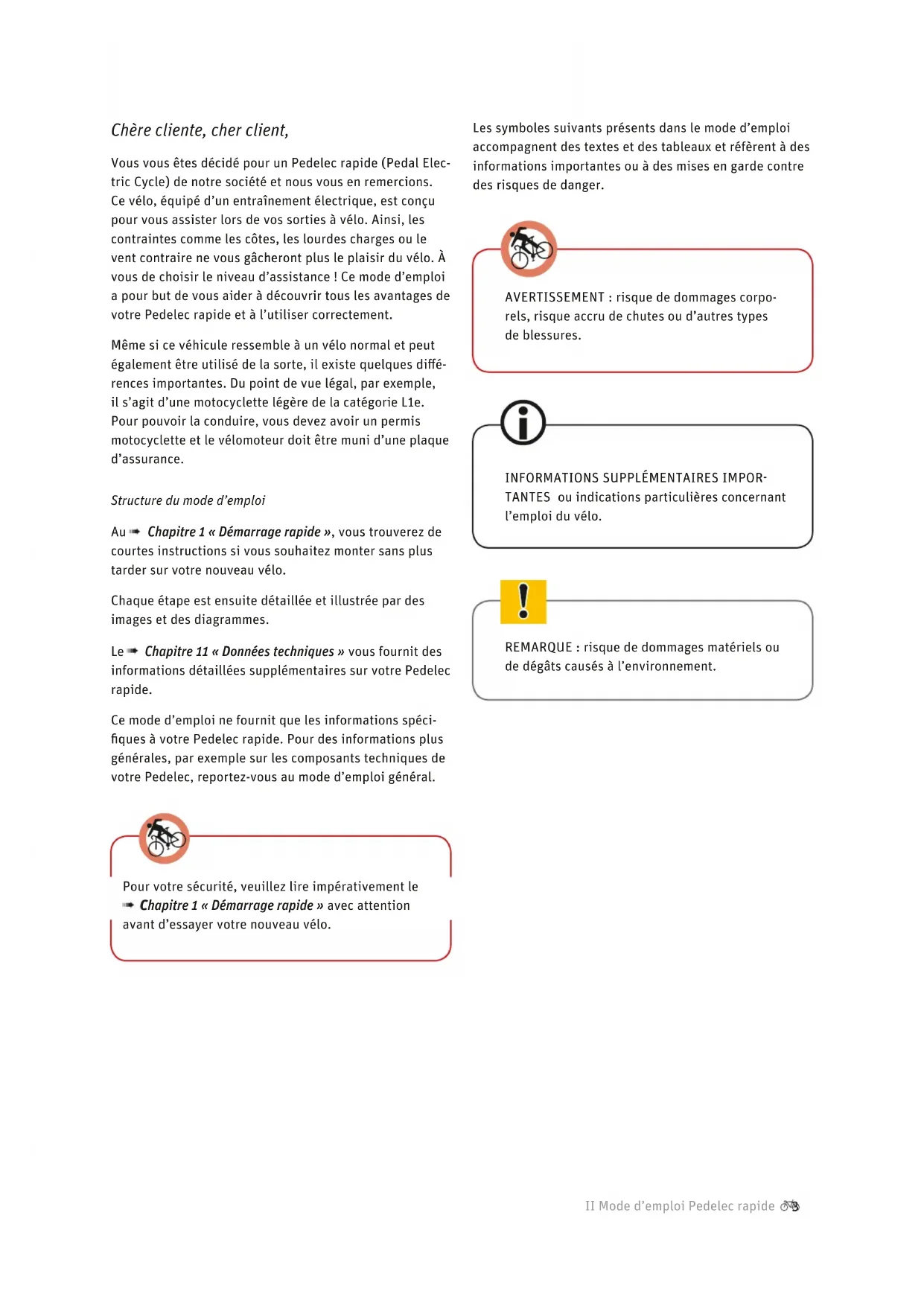 Ce mode d'emploi ne fournit que les informations spécifiées à votre Pedelec rapide. Pour des informations plus générales, par exemple sur les composants techniques de votre Pedelec, reportez-vous au mode d'emploi général.