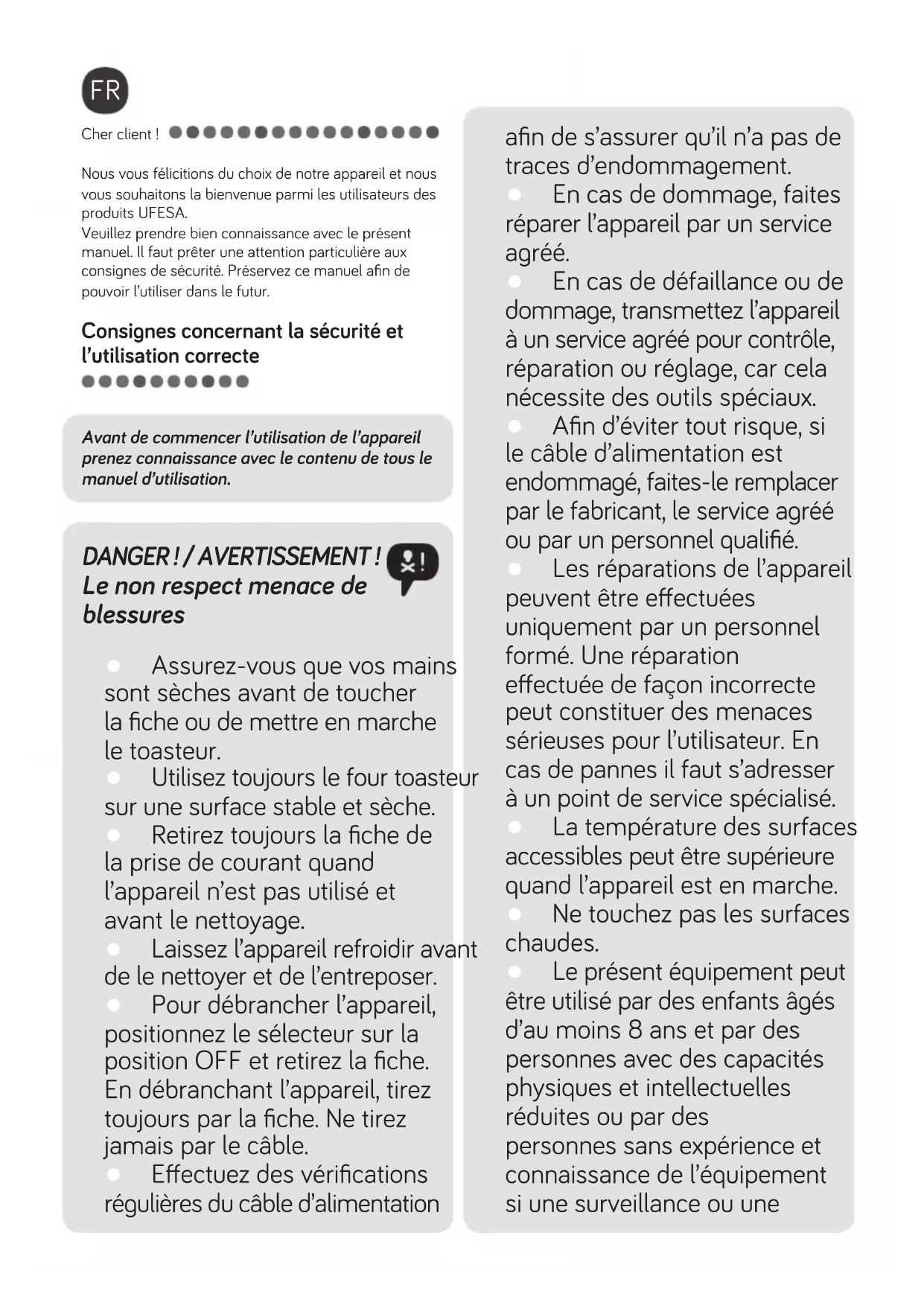 The toaster oven walls and the glass door can be cleaned with a damp cloth or with an oven cleaner product. Do not use harsh detergents or abrasive cleaning agents. Do not use steel or wool scouring pads, abrasivecleaners or scrap the walls with a metal utensils, as all of these methods may damage the porcelain enamel coating. Disposal Dispose of packaging in an environmentally-friendly manner. Our goods come in optimised packaging. This basically consists in using non-contaminating materials which should be handed over to the local waste disposal service as secondary raw materials. This appliance is labelled in accordance with European Directive 2012/19/EU concerning used electrical and electronic appliances (waste electrical and electronic equipment – WEEE). The guideline determines the framework for the return and recycling of used appliances as applicable throughout the EU. Please ask your specialist retailer about current disposal facilities. The manufacturer does not accept any liability for any damages resulting from unintended use or inappropriate handling. The manufacturer reserves his right to modify the product any time in order to adjust it to the law, standards, directives, or due to construction, trade, aesthetic or other reasons, without prior notice.Cher client ! Nous vous félicitions du choix de notre appareil et nous vous souhaitons la bienvenue parmi les utilisateurs des produits UFESA. Veuillez prendre bien connaissance avec le présent manuel. Il faut prêter une attention particulière aux consignes de sécurité. Préservez ce manuel afin de pouvoir l’utiliser dans le futur. Consignes concernant la sécurité et l’utilisation correcte Avant de commencer l’utilisation de l’appareil prenez connaissance avec le contenu de tous le manuel d’utilisation. DANGER ! / AVERTISSEMENT ! Le non respect menace de blessures ● Assurez-vous que vos mains sont sèches avant de toucher la fiche ou de mettre en marche le toasteur. ● Utilisez toujours le four toasteur sur une surface stable et sèche. ● Retirez toujours la fiche de la prise de courant quand l’appareil n’est pas utilisé et avant le nettoyage. ● Laissez l’appareil refroidir avant de le nettoyer et de l’entreposer. ● Pour débrancher l’appareil, positionnez le sélecteur sur la position OFF et retirez la fiche. En débranchant l’appareil, tirez toujours par la fiche. Ne tirez jamais par le câble. ● Eectuez des vérifications régulières du câble d’alimentation afin de s’assurer qu’il n’a pas de traces d’endommagement. ● En cas de dommage, faites réparer l’appareil par un service agréé. ● En cas de défaillance ou de dommage, transmettez l’appareil à un service agréé pour contrôle, réparation ou réglage, car cela nécessite des outils spéciaux. ● Afin d’éviter tout risque, si le câble d’alimentation est endommagé, faites-le remplacer par le fabricant, le service agréé ou par un personnel qualifié. ● Les réparations de l’appareil peuvent être eectuées uniquement par un personnel formé. Une réparation eectuée de façon incorrecte peut constituer des menaces sérieuses pour l’utilisateur. En cas de pannes il faut s’adresser à un point de service spécialisé. ● La température des surfaces accessibles peut être supérieure quand l’appareil est en marche. ● Ne touchez pas les surfaces chaudes. ● Le présent équipement peut être utilisé par des enfants âgés d’au moins 8 ans et par des personnes avec des capacités physiques et intellectuelles réduites ou par des personnes sans expérience et connaissance de l’équipement si une surveillance ou une FRformation en ce qui concerne l’utilisation de l’équipement de façon sûre et l’explication compréhensible des dangers possibles qu’y sont liés, seront assurées. Les enfants ne devraient pas jouer avec l’équipement. Le nettoyage de l’appareil et la réalisation d’activités de maintenance ne devraient pas être eectués par des enfants, à moins qu’ils n’aient fini leurs 8 ans et une surveillance appropriée sur eux soit assurée. ● L’appareil avec le câble d’alimentation doit être entreposé dans un endroit inaccessible aux enfants âgés de moins de 8 ans. ● Ne jamais plonger l’appareil ni le câble d’alimentation dans de l’eau ou un autre liquide. ● N’utilisez jamais d’appareils avec un câble ou une fiche endommagés, après l’apparition d’un fonctionnement défectueux ou s’ils ont été endommagés de quelconque façon. ● L’appareil génère de la chaleur au cours du travail. Des mesures de prudence appropriées doivent être respectées afin de prévenir le risque de carbonisation, de brûlure, d’incendie ou d’une autre lésion du corps et d’endommagement d’objets dû au contact avec les surfaces externes lors de l’utilisation de l’appareil ou de son refroidissement. ● Utilisez la poignée de porte pour ouvrir ou fermer la porte du four. ● Utilisez la poignée pour introduire ou retirer la plaque du four. ● Soyez très prudent en retirant la plaque ou en éliminant l’huile chaude de la plaque. ● Ne placez jamais les matières suivantes sur l’appareil : carton, plastique, papier, bougie, matières inflammables. ● Ne placez pas d’objets lourds sur la porte ouverte. ● Evitez les projections d’eau sur la vitre lors de l’utilisation de l’appareil ou juste après. Lavitre peut se briser. ● N’utiliser l’appareil que dans des pièces intérieures àtempérature ambiante et jusqu’à 2000 m au-dessus du niveau de la mer. ● – La température des surfaces accessibles peut être supérieure quand l’appareil est en marche. Ne touchez pas la surface avec le symbole.Construction du toasteur
