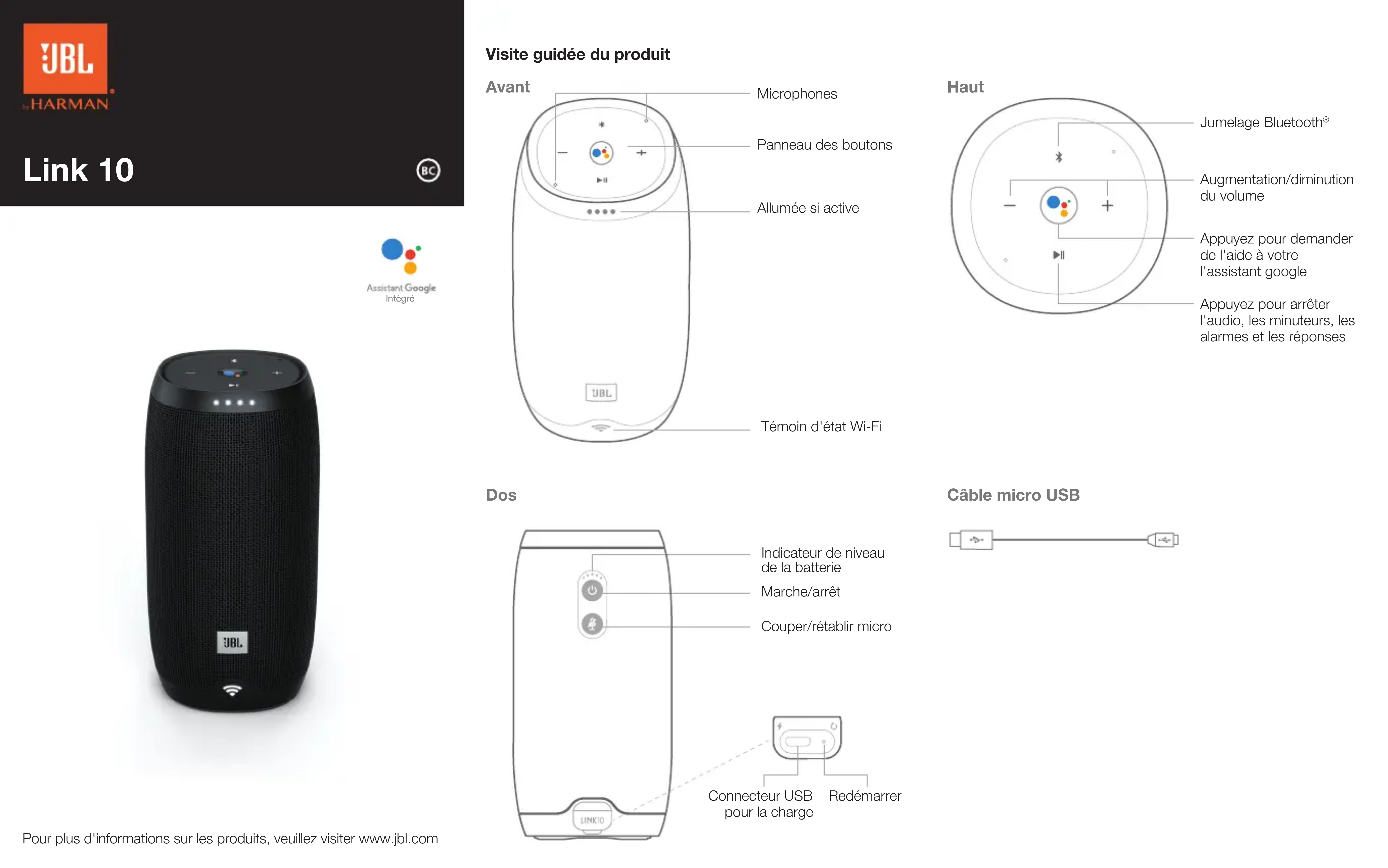 Link 10 Avant Visite guidée du produit Pour plus d'informations sur les produits, veuillez visiter www.jbl.com Panneau des boutons Allumée si active Témoin d'état Wi-Fi Microphones Dos Indicateur de niveau de la batterie Marche/arrêt Couper/rétablir micro Câble micro USB Intégré Connecteur USB pour la charge Redémarrer Haut Jumelage Bluetooth