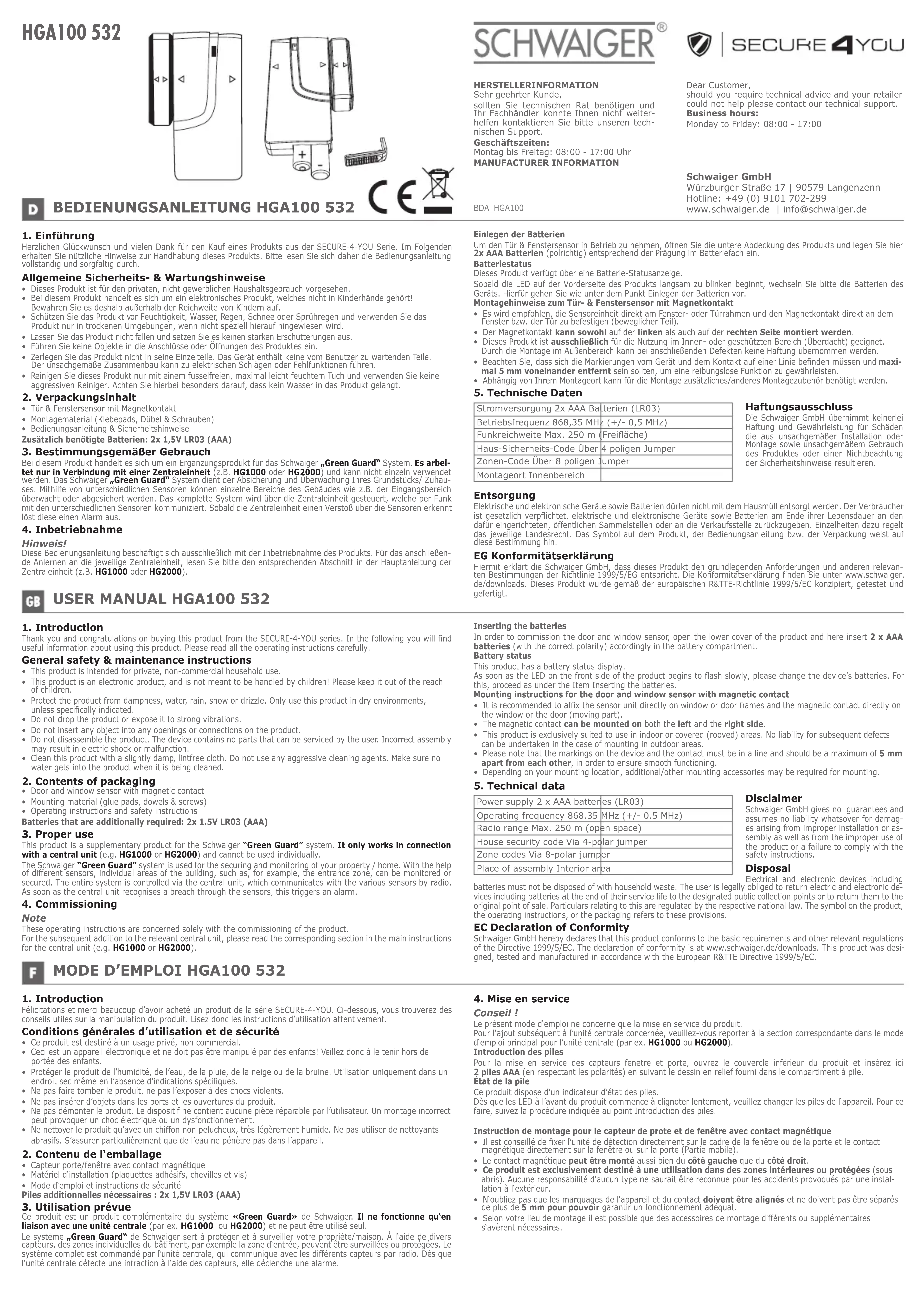 - Selon votre lieu de montage il est possible que des accessoires de montage différents ou supplémentaires s‘avèrent nécessaires. BEDIENUNGSANLEITUNG HGA100 532 BDA_HGA100 HGA100 532 Schwaiger GmbH Würzburger Straße 17 | 90579 Langenzenn Hotline: +49 (0) 9101 702-299 www.schwaiger.de | info@schwaiger.de HERSTELLERINFORMATIONSehr geehrter Kunde, sollten Sie technischen Rat benötigen und Ihr Fachhändler konnte Ihnen nicht weiter-helfen kontaktieren Sie bitte unseren tech-nischen Support.Geschäftszeiten:Montag bis Freitag: 08:00 - 17:00 UhrMANUFACTURER INFORMATIONDear Customer,should you require technical advice and your retailer could not help please contact our technical support.Business hours:Monday to Friday: 08:00 - 17:00Stromversorgung 2x AAA Batterien (LR03)Betriebsfrequenz 868,35 MHz (+/- 0,5 MHz)Funkreichweite Max. 250 m (Freifläche)Haus-Sicherheits-Code Über 4 poligen JumperZonen-Code Über 8 poligen JumperMontageort InnenbereichPower supply 2 x AAA batteries (LR03)Operating frequency 868.35 MHz (+/- 0.5 MHz)Radio range Max. 250 m (open space)House security code Via 4-polar jumperZone codes Via 8-polar jumperPlace of assembly Interior areaISTRUZIONI PER L‘USO HGA100 532