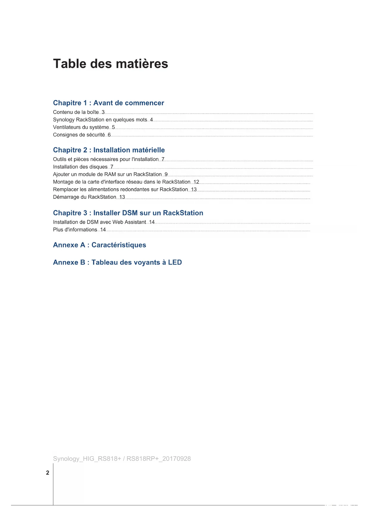 Installation de DSM avec Web Assistant 14 Plus d'informations 14 Annexe A : Caractéristiques Annexe B : Tableau des voyants à LED Synology_HIG_RS818+ / RS818RP+_20170928 2Nous vous remercions d'avoir acheté un produit Synology. Avant d'installer votre nouveau RackStation, veuillez vérier le contenu du colis an de vous assurer que vous avez reçu les éléments ci-dessous. Veillez également à lire attentivement les instructions de sécurité pour éviter de vous blesser ou d'endommager votre RackStation. Remarque : toutes les images ci-dessous sont fournies uniquement à titre d'illustration et peuvent être diérentes du produit réel. Contenu de la boîte Unité principale x 1Cordon d'alimentation secteur Kit de montage en rack x 20 vis de xation pour disques durs 3.5"20 vis de xation pour disques durs 2.5"Vis pour kit de montage en rack x 8Clé de tiroir du disque dur x 2 Avant de commencer