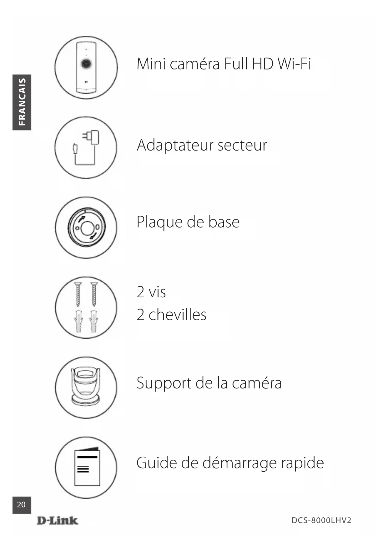 FRANCAIS Guide de démarrage rapide Adaptateur secteur Mini caméra Full HD Wi-Fi 2 vis 2 chevilles Support de la caméra Plaque de baseDCS-8000LHV2 FRANCAIS Recherchez mydlink et téléchargez l'application. Remarque: Ce produit est incompatible avec d’autres applications mydlink, telles que « mydlink Home », « mydlink Lite », etc. Télécharger l'application