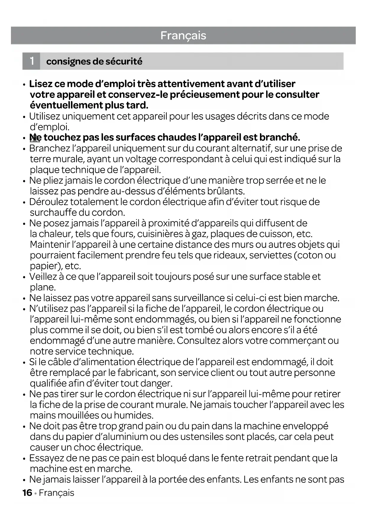 Si, pour une raison quelconque, un morceau de pain est bloqué dans le fente du grille-pain, n'essayez pas de le retirer aussitôt, mais commencez par débrancher l'appareil en retirant la prise de courant. Puis laisser refroidir le grille-pain et vous pourrez alors essayer de retirer le morceau de pain. Pousser le bouton pour l'ascenseur de pain en haut. Attention à ne pas toucher les éléments de chauffe.