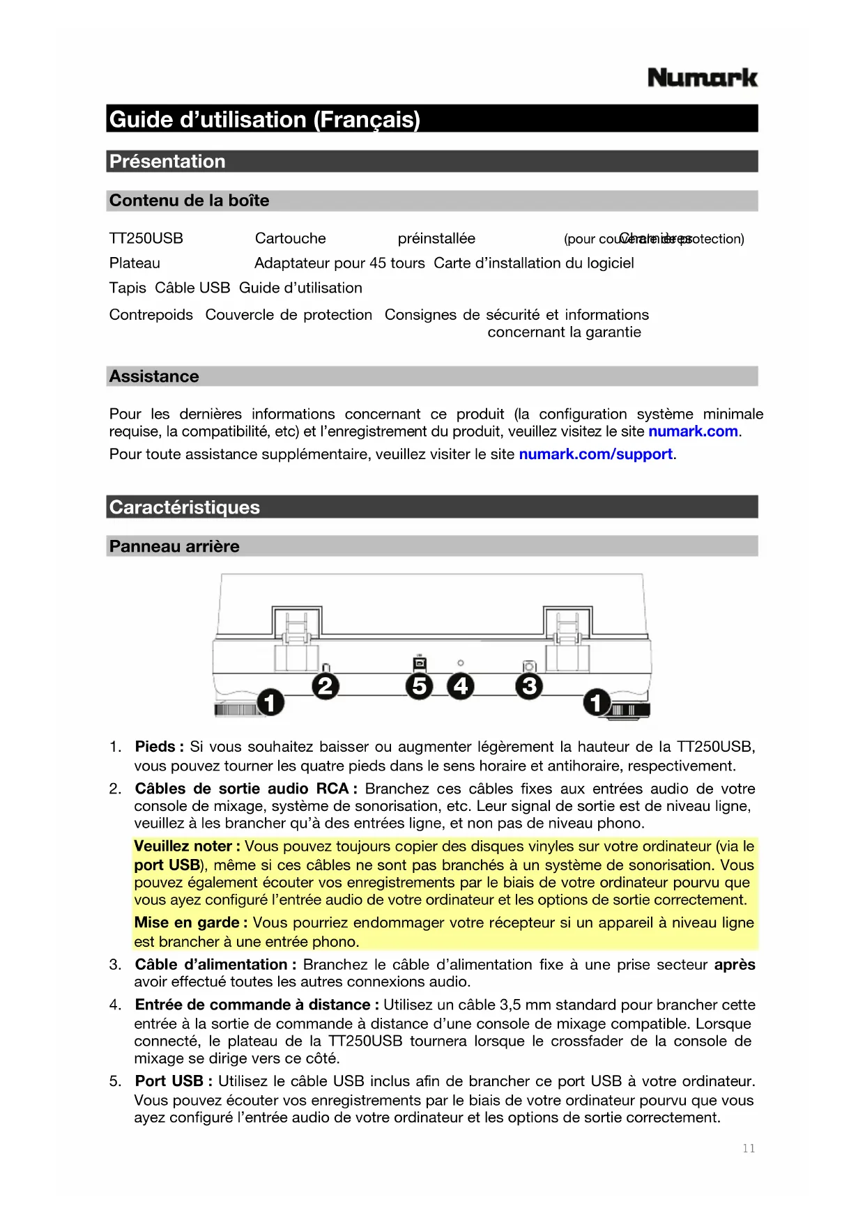 daptateur pour 45 tours Carte d’installation du logiciel Tapis Câble USB Guide d’utilisation Contrepoids Couvercle de protection Consignes de sécurité et informations concernant la garantie Assistance Pour les dernières informations concernant ce produit (la configuration système minimale requise, la compatibilité, etc) et l’enregistrement du produit, veuillez visitez le site numark.com. Pour toute assistance supplémentaire, veuillez visiter le site numark.com/support.