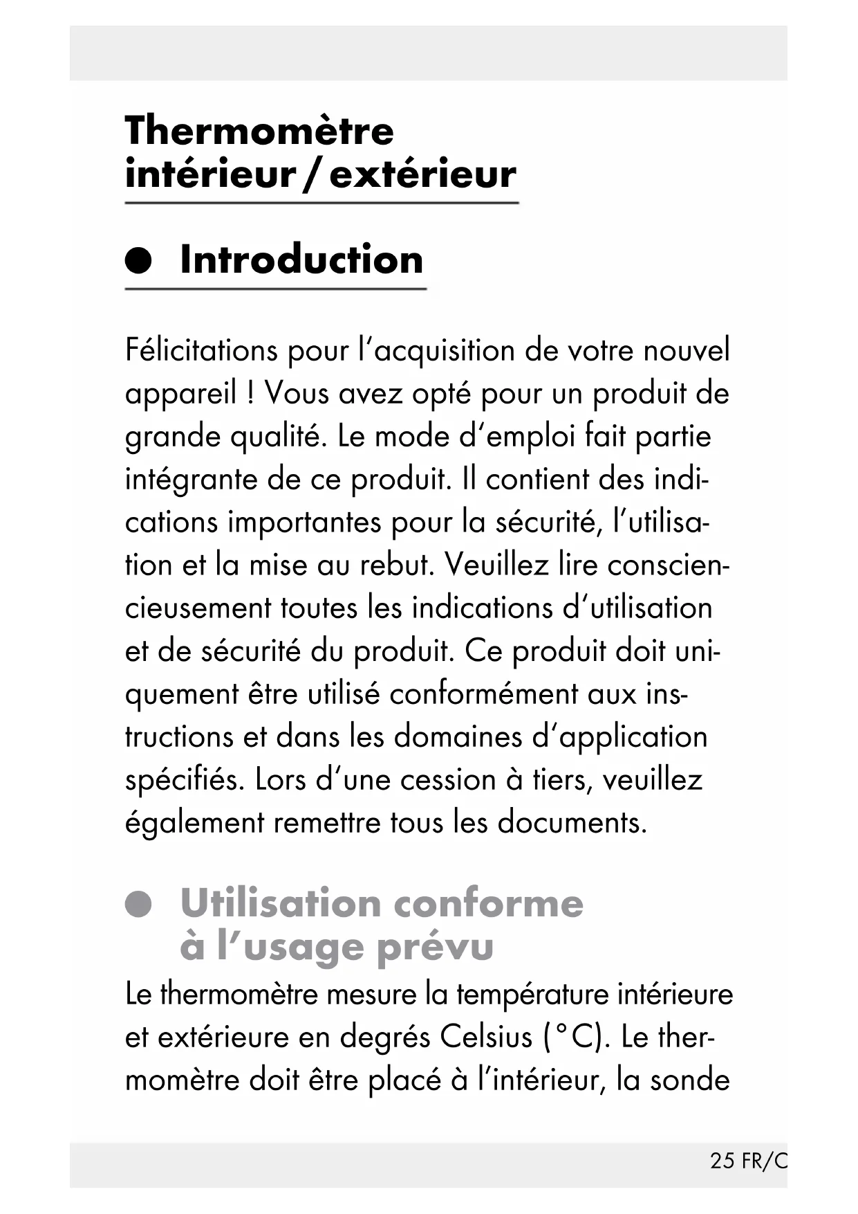 Le thermomètre mesure la température interieure et extérieure en degrés Celsius (°C). Le thermomètre doit être place à l'intérieur, la sonde