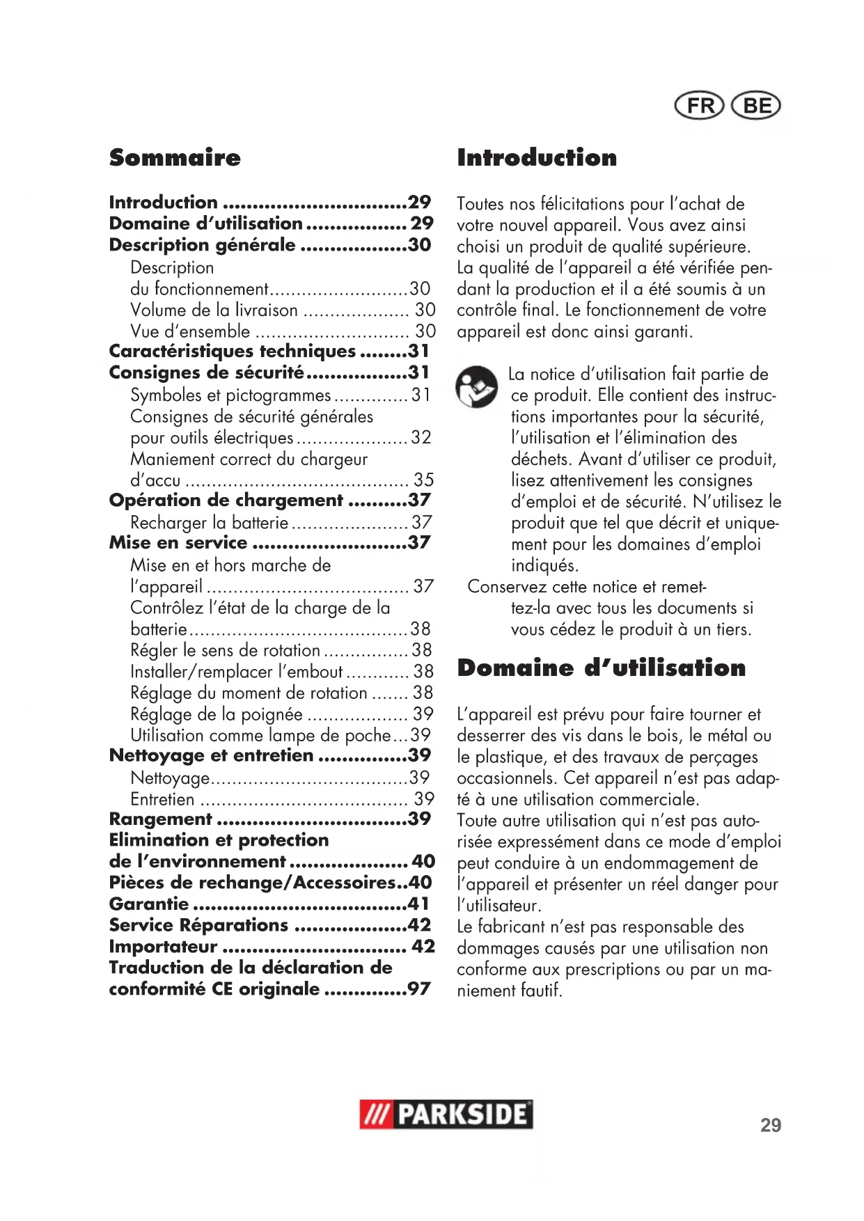 - Introduction Toutes nos félicitations pour l’achat de votre nouvel appareil. Vous avez ainsi choisi un produit de qualité supérieure. La qualité de l’appareil a été vériée pen- dant la production et il a été soumis à un contrôle nal. Le fonctionnement de votre appareil est donc ainsi garanti. La notice d’utilisation fait partie de ce produit. Elle contient des instruc- tions importantes pour la sécurité, l’utilisation et l’élimination des déchets. Avant d’utiliser ce produit, lisez attentivement les consignes d’emploi et de sécurité. N’utilisez le produit que tel que décrit et unique- ment pour les domaines d’emploi indiqués. Conservez cette notice et remet- tez-la avec tous les documents si vous cédez le produit à un tiers. Domaine d’utilisation L’appareil est prévu pour faire tourner et desserrer des vis dans le bois, le métal ou le plastique, et des travaux de perçages occasionnels. Cet appareil n’est pas adap- té à une utilisation commerciale. Toute autre utilisation qui n’est pas auto- risée expressément dans ce mode d’emploi peut conduire à un endommagement de l’appareil et présenter un réel danger pour l’utilisateur. Le fabricant n’est pas responsable des dommages causés par une utilisation non conforme aux prescriptions ou par un ma- niement fautif. Traduction de la déclaration de conformité CE originale FR BE Description générale Vous trouverez les illustra- tions sur la page de rabat avant. Description du fonctionnement La visseuse sans l avec rotation à droite/à gauche est dotée de 6 positions de moment de rotation, un mode perçage et une lumière LED de travail. L’appareil peut également être utilisé en tant que lampe de poche. Pour la fonction des pièces de service, veuillez vous reporter aux descriptions suivantes. Volume de la livraison Déballez l’appareil et vériez que la livrai- son est complète. Evacuez le matériel d’emballage comme il se doit. - Visseuse sans l - Chargeur - 26 embouts - 1 Porte embouts - Coffre - Notice d’utilisation 26 embouts: Fente N°N°N°N°N°N°N° Crois Crois Torx Hexagonal p. 9730