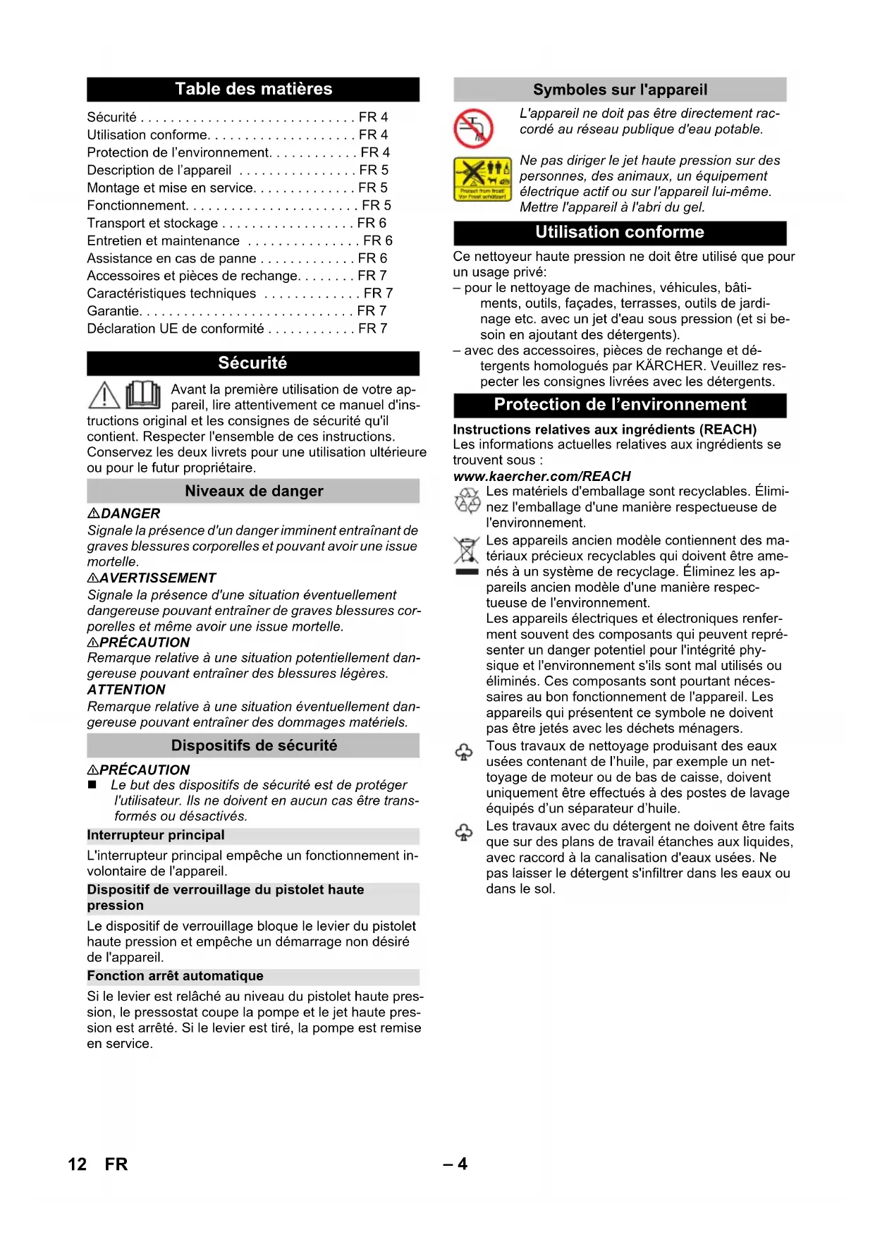 90 dB(A) Subject to technical changes. Warranty EU Declaration of Conformity Product: High pressure cleaner Type: 1.673-xxx Relevant EU Directives 2000/14/EC 2014/30/EU 2006/42/EC (+2009/127/EC) 2011/65/EU Applied harmonized standards EN 50581 EN 55014–1: 2006+A1: 2009+A2: 2011 EN 55014–2: 2015 EN 60335–1 EN 60335–2–79 EN 61000–3–2: 2014 EN 61000–3–3: 2013 EN 62233: 2008 Applied conformity evaluation method 2000/14/EC: Appendix V Sound power level dB(A) Measured: 88 Guaranteed: 90 Winnenden, 2016/08/01 CEO Head of Approbation 11EN– 4 Avant la première utilisation de votre ap- pareil, lire attentivement ce manuel d'ins- tructions original et les consignes de sécurité qu'il contient. Respecter l'ensemble de ces instructions. Conservez les deux livrets pour une utilisation ultérieure ou pour le futur propriétaire. DANGER Signale la présence d'un danger imminent entraînant de graves blessures corporelles et pouvant avoir une issue mortelle. 몇 AVERTISSEMENT Signale la présence d'une situation éventuellement dangereuse pouvant entraîner de graves blessures cor- porelles et même avoir une issue mortelle. 몇 PRÉCAUTION Remarque relative à une situation potentiellement dan- gereuse pouvant entraîner des blessures légères. ATTENTION Remarque relative à une situation éventuellement dan- gereuse pouvant entraîner des dommages matériels. 몇 PRÉCAUTION Le but des dispositifs de sécurité est de protéger l'utilisateur. Ils ne doivent en aucun cas être trans- formés ou désactivés. L'interrupteur principal empêche un fonctionnement in- volontaire de l'appareil. Le dispositif de verrouillage bloque le levier du pistolet haute pression et empêche un démarrage non désiré de l'appareil. Si le levier est relâché au niveau du pistolet haute pres- sion, le pressostat coupe la pompe et le jet haute pres- sion est arrêté. Si le levier est tiré, la pompe est remise en service. Ce nettoyeur haute pression ne doit être utilisé que pour un usage privé: – pour le nettoyage de machines, véhicules, bâti- ments, outils, façades, terrasses, outils de jardi- nage etc. avec un jet d'eau sous pression (et si be- soin en ajoutant des détergents). – avec des accessoires, pièces de rechange et dé- tergents homologués par KÄRCHER. Veuillez res- pecter les consignes livrées avec les détergents. Instructions relatives aux ingrédients (REACH) Les informations actuelles relatives aux ingrédients se trouvent sous : www.kaercher.com/REACH Table des matières Sécurité ... FR 4 Utilisation conforme... FR 4 Protection de l’environnement... FR 4 Description de l’appareil ... FR 5 Montage et mise en service... FR 5 Fonctionnement... FR 5 Transport et stockage ... FR 6 Entretien et maintenance ... FR 6 Assistance en cas de panne ... FR 6 Accessoires et pièces de rechange... FR 7 Caractéristiques techniques ... FR 7 Garantie... FR 7 Déclaration UE de conformité ... FR 7 Sécurité Niveaux de danger Dispositifs de sécurité Interrupteur principal Dispositif de verrouillage du pistolet haute pression Fonction arrêt automatique Symboles sur l'appareil L'appareil ne doit pas être directement rac- cordé au réseau publique d'eau potable. Ne pas diriger le jet haute pression sur des personnes, des animaux, un équipement électrique actif ou sur l'appareil lui-même. Mettre l'appareil à l'abri du gel. Utilisation conforme Protection de l’environnement Les matériels d'emballage sont recyclables. Élimi- nez l'emballage d'une manière respectueuse de l'environnement. Les appareils ancien modèle contiennent des ma- tériaux précieux recyclables qui doivent être ame- nés à un système de recyclage. Éliminez les ap- pareils ancien modèle d'une manière respec- tueuse de l'environnement. Les appareils électriques et électroniques renfer- ment souvent des composants qui peuvent repré- senter un danger potentiel pour l'intégrité phy- sique et l'environnement s'ils sont mal utilisés ou éliminés. Ces composants sont pourtant néces- saires au bon fonctionnement de l'appareil. Les appareils qui présentent ce symbole ne doivent pas être jetés avec les déchets ménagers. Tous travaux de nettoyage produisant des eaux usées contenant de l’huile, par exemple un net- toyage de moteur ou de bas de caisse, doivent uniquement être effectués à des postes de lavage équipés d’un séparateur d’huile. Les travaux avec du détergent ne doivent être faits que sur des plans de travail étanches aux liquides, avec raccord à la canalisation d'eaux usées. Ne pas laisser le détergent s'infiltrer dans les eaux ou dans le sol. 12 FR– 5 L'étendue de la livraison de l'appareil (selon le modèle) figure sur l'emballage. Ce manuel d'utilisation décrit toutes les options possibles. Pour les illustrations, voir les pages de graphiques 1 Raccord haute pression 2 Interrupteur principal "0/OFF" / "I/ON" 3 Crochet de rangement 4 Poignée de transport 5 Poignée de transport, amovible 6 Support pour la lance 7 Rangement pour pistolet haute pression 8 Arrivée d'eau avec tamis intégré 9 Raccord pour l'arrivée d'eau 10 Câble d'alimentation secteur avec fiche secteur 11 Roulette de transport 12 Pistolet haute pression 13 Dispositif de verrouillage du pistolet haute pression 14 Agrafe pour le flexible haute pression 15 Flexible haute pression 16 Lance Full Control rotabuse Pour les salissures tenaces Niveau de pression : HARD 17 Lance Vario Power Full Control Pour les travaux courants de nettoyage Niveaux de pression : HARD / MEDIUM / SOFT / MIX Pour les illustrations, voir les pages de graphiques Illustrations - Monter les pièces jointes en vrac à l'appareil avant la mise en service. Garer l'appareil sur une surface plane. Illustrations - Retirer le clip du pistolet haute pression et insérer le flexible haute pression dans le pistolet haute pression. Enfoncer les agrafes jusqu'á ce qu'elles s'en- clenchent. Contrôler que la connexion est bien fixée e