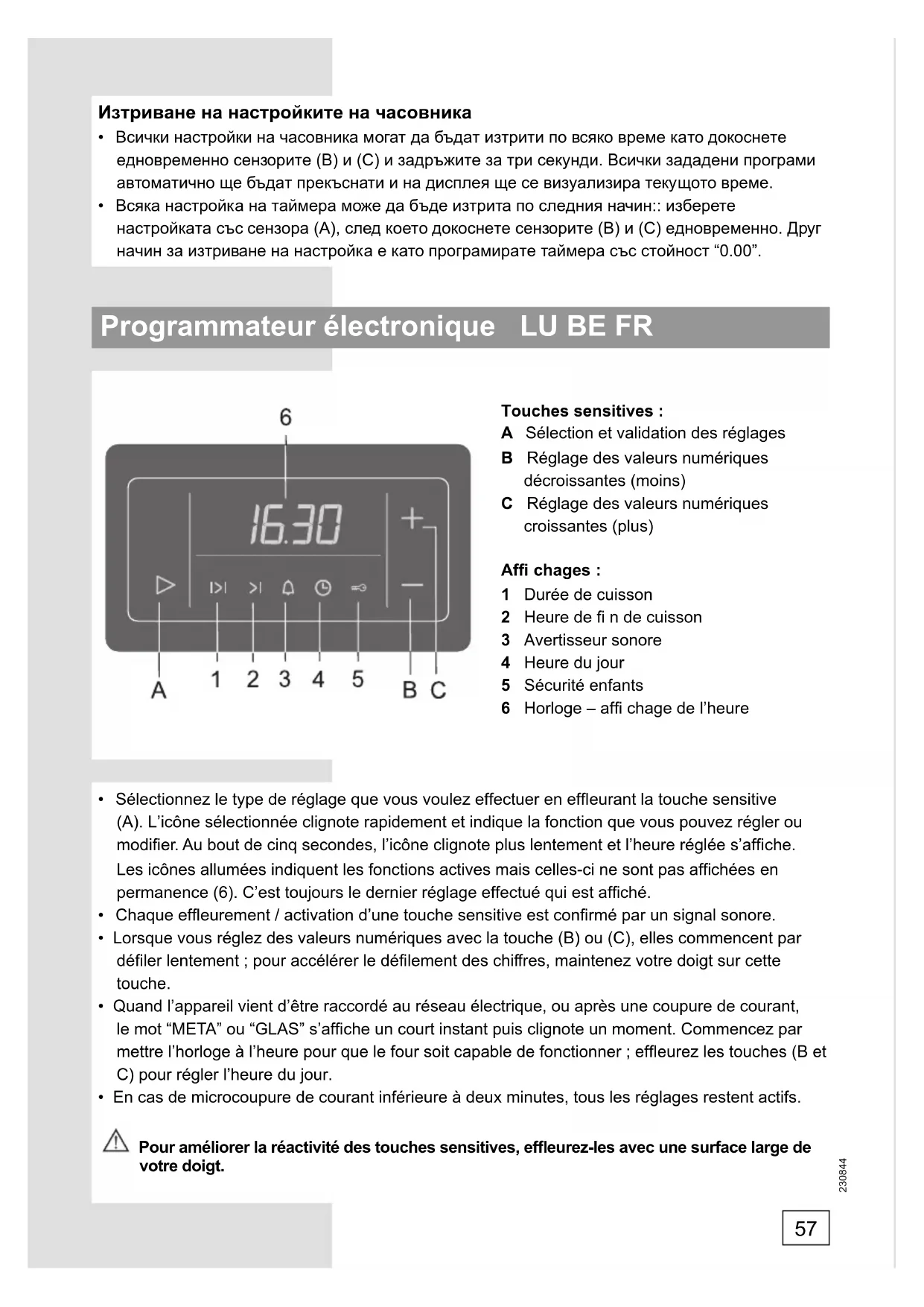 - En cas de microcoupure de courant inférieure à deux minutes, tous les réglages restent actifs. Pour améliorer la réactivité des touches sensitives, effl eurez-les avec une surface large de votre doigt.